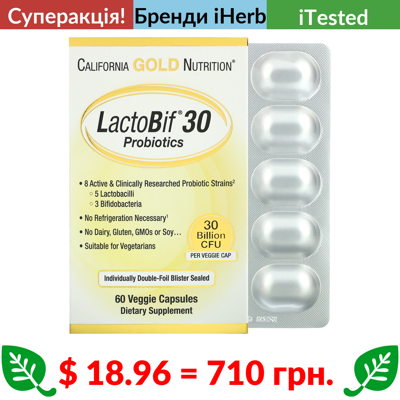 $ 18.96 = 710 грн. ???? cуперакція! ???? California Gold Nutrition, LactoBif, пробіотики, 30 млрд КУО, 60 рослинних капсул