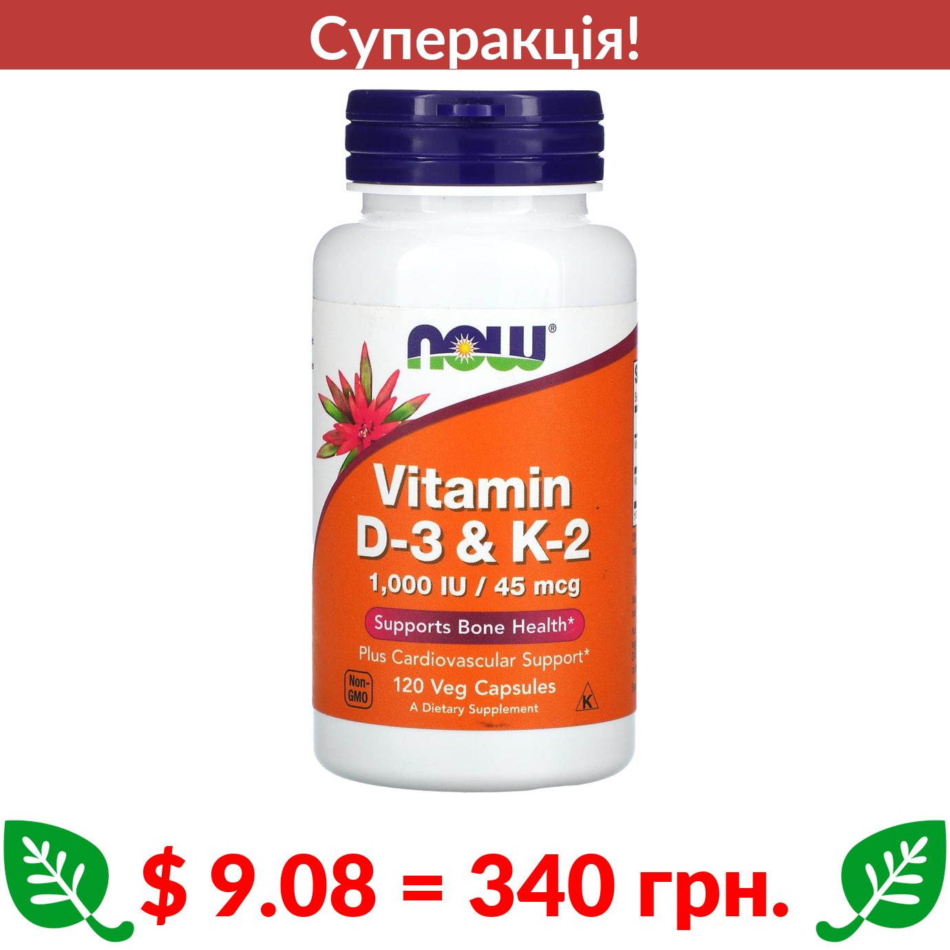 $ 9.08 = 340 грн. ???? cуперакція! ???? Now Foods, вітаміни D3 та K2, 120 рослинних капсул