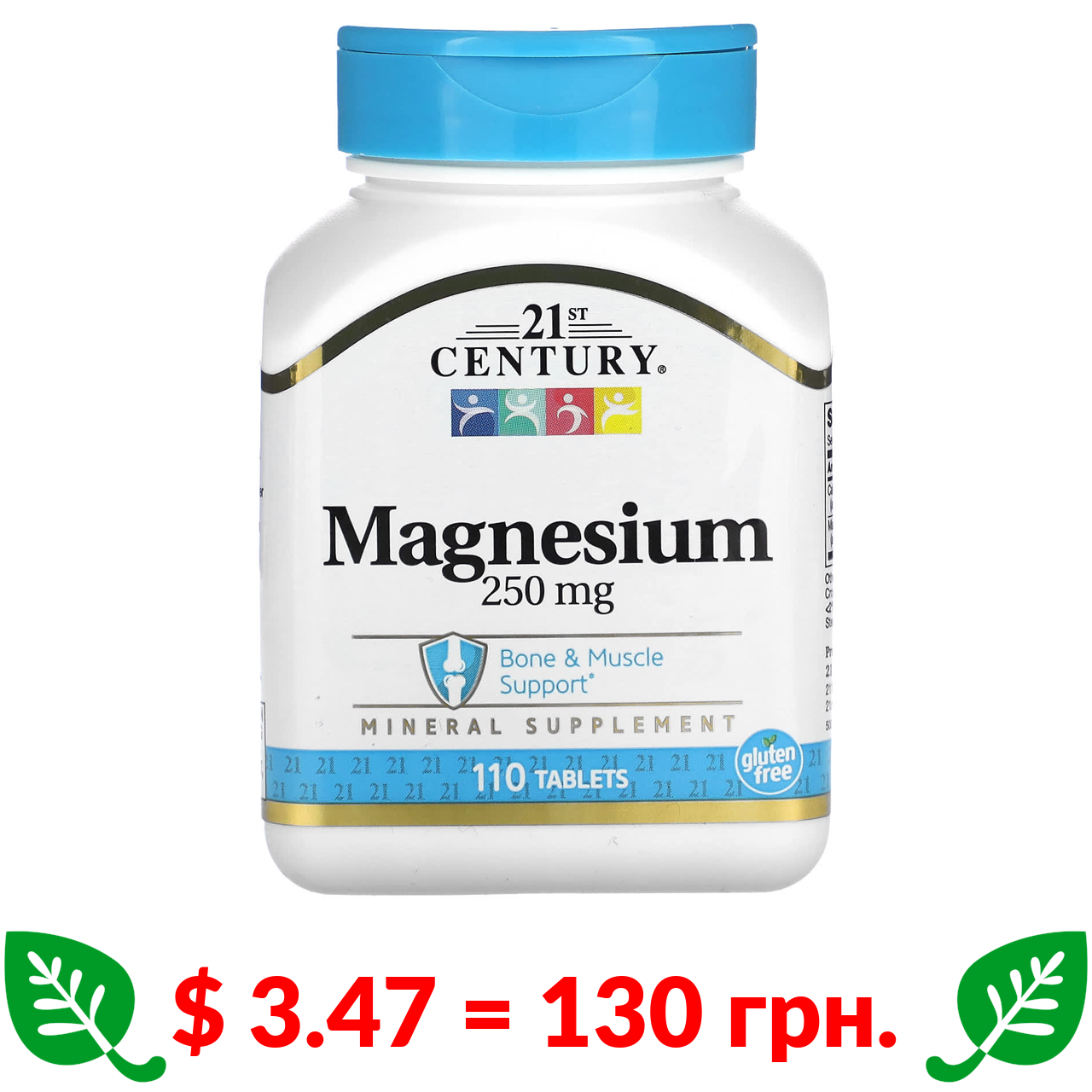 $ 3.47 = 130 грн. 21st Century, магній, 250 мг, 110 таблеток