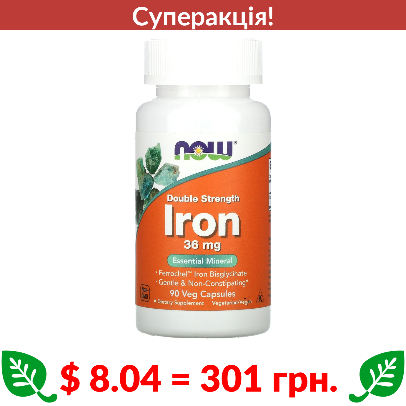 $ 8.04 = 301 грн. ???? cуперакція! ???? Now Foods, залізо подвійної концентрації, 36 мг, 90 вегетаріанських капсул