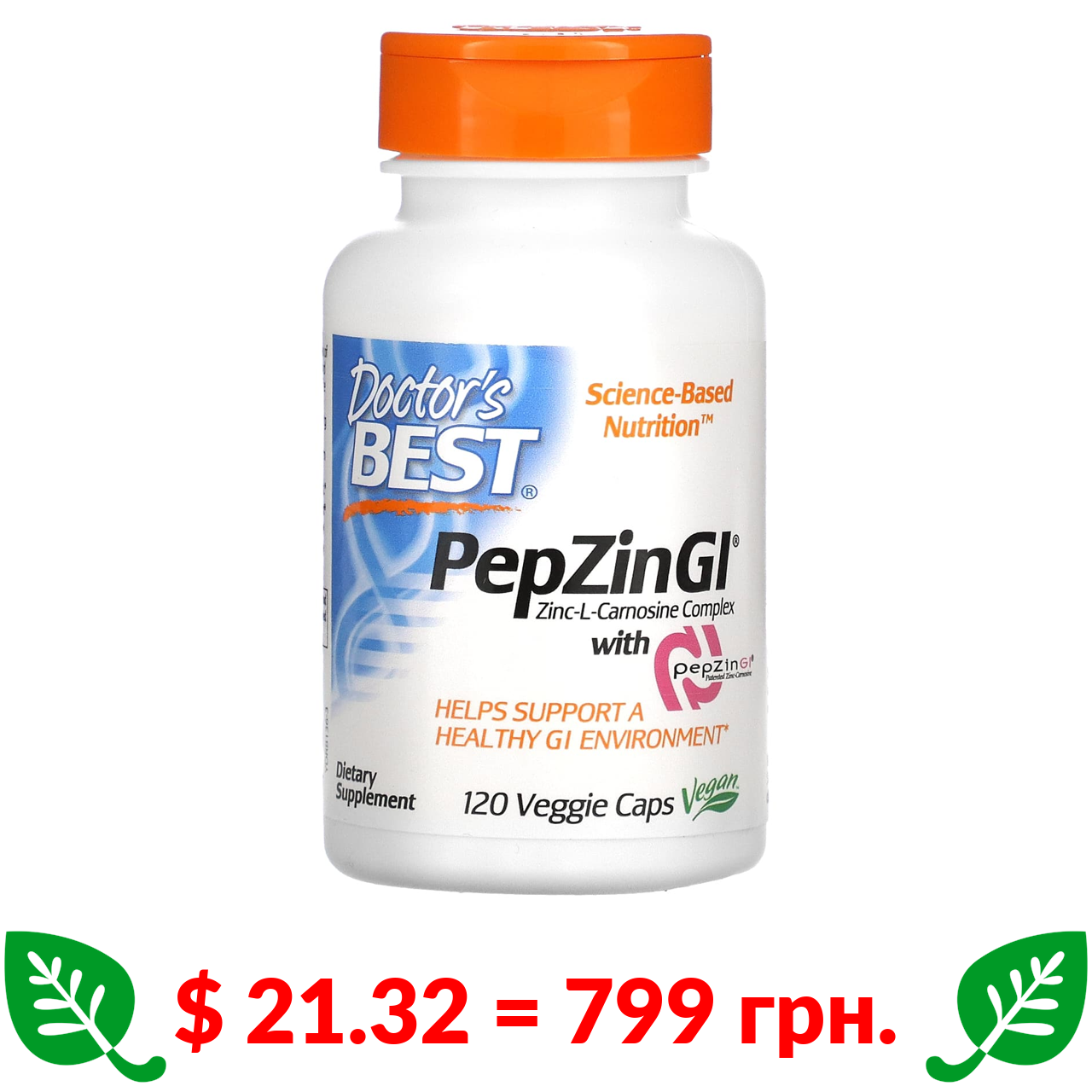 $ 21.32 = 799 грн. Doctor’s Best, PepZin GI, комплекс цинк-L-карнозина, 120 рослинних капсул
