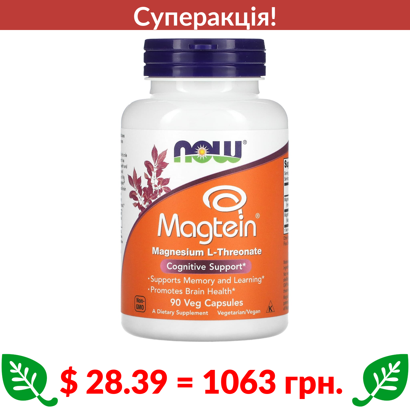 $ 28.39 = 1063 грн. ???? cуперакція! ???? Now Foods, Magtein, магній L-треаонат, 90 рослинних капсул