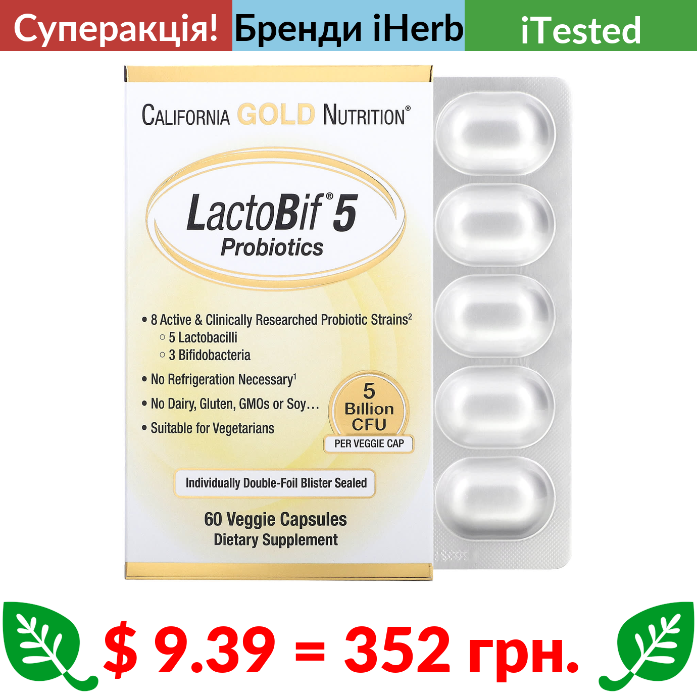 $ 9.39 = 352 грн. ???? cуперакція! ???? California Gold Nutrition, LactoBif, пробіотики, 5 млрд КУО, 60 вегетаріанських капсул