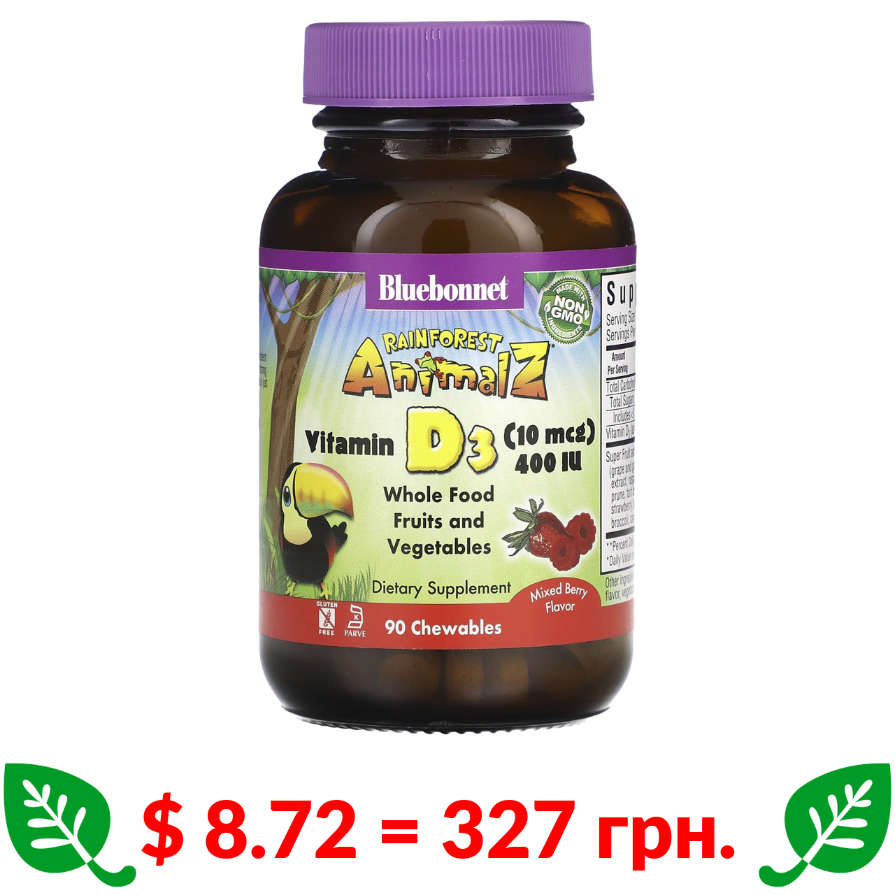 $ 8.72 = 327 грн. Bluebonnet Nutrition, Rainforest Animalz, вітамін D3, зі смаком натурального ягідного асорті, 400 МО, 90 жувальних таблеток