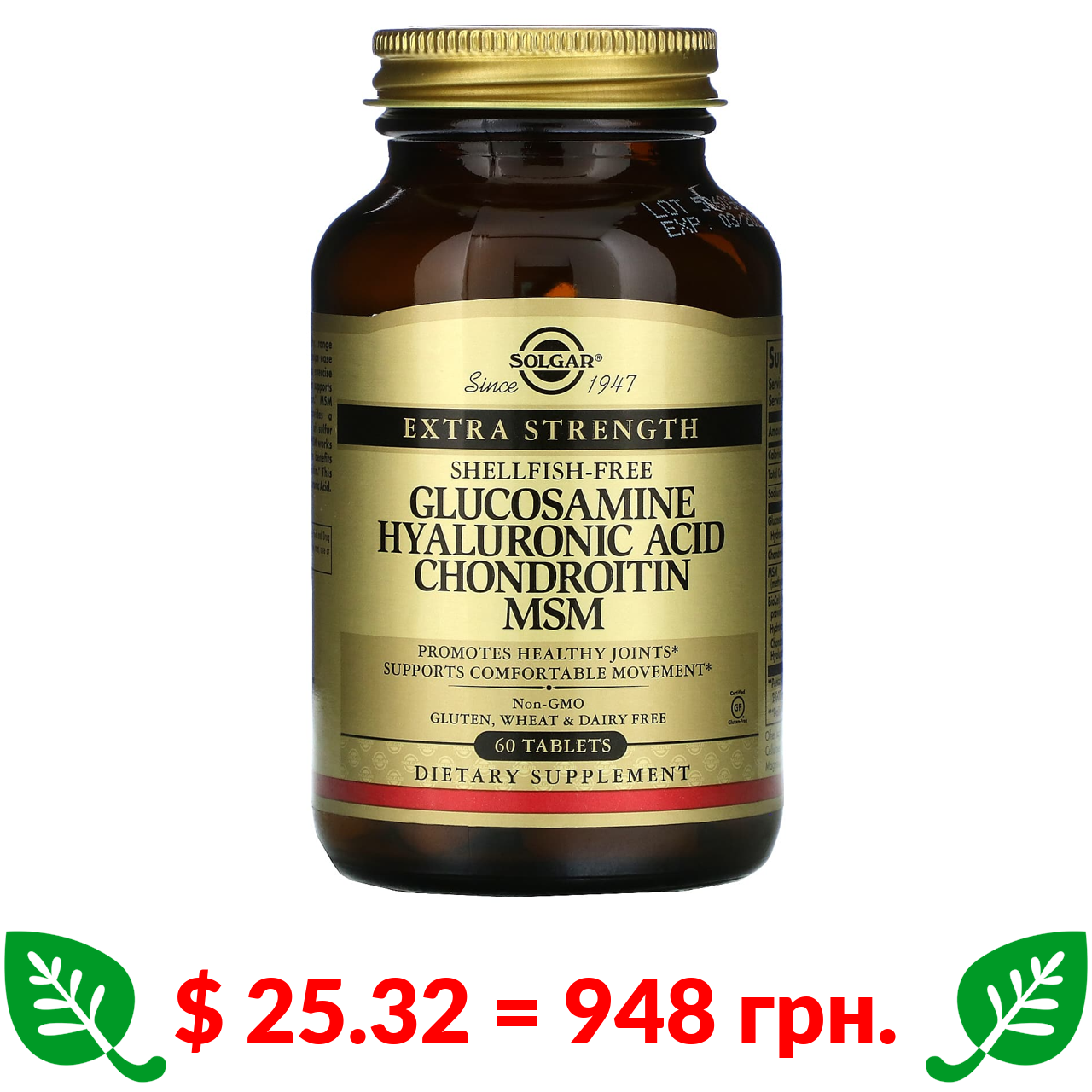 $ 25.32 = 948 грн. Solgar, глюкозамін, гіалуронова кислота, хондроїтин і МСМ, 60 таблеток