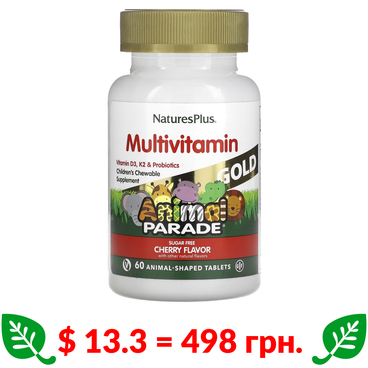 $ 13.3 = 498 грн. Nature’s Plus, Source of Life, Animal Parade Gold, жувальна добавка з мультивітамінами та мікроелементами для дітей, смак вишні, 60 таблеток у формі тварин