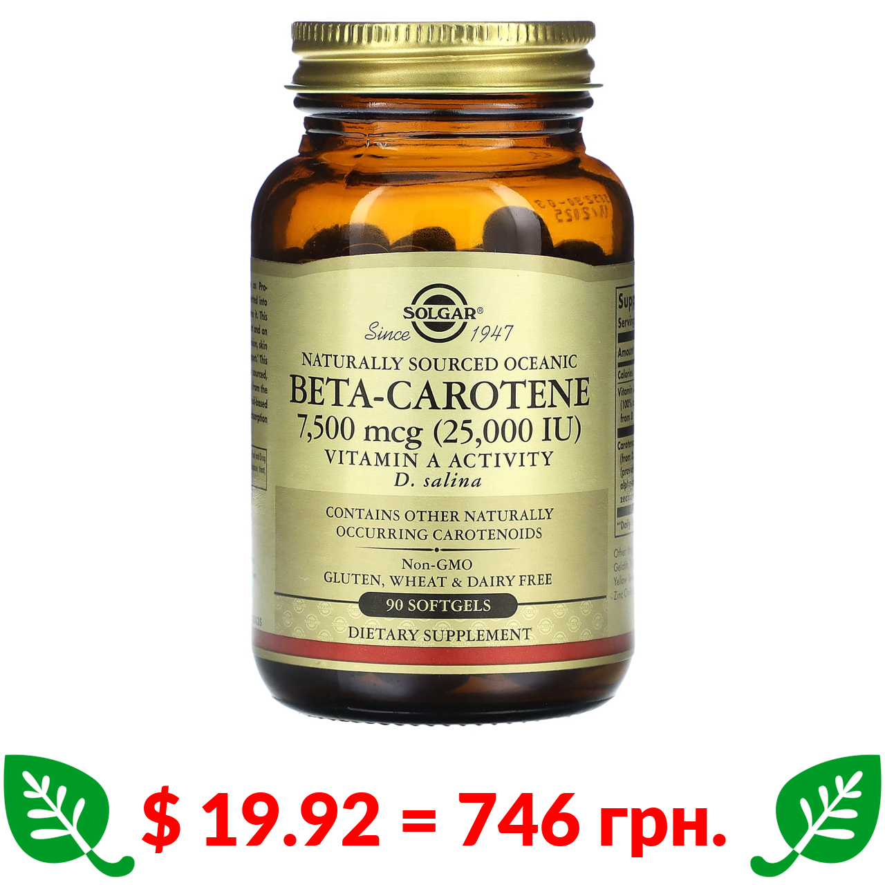 $ 19.92 = 746 грн. Solgar, натуральний бета-каротин, 7500 мкг (25 000 МО), 90 капсул