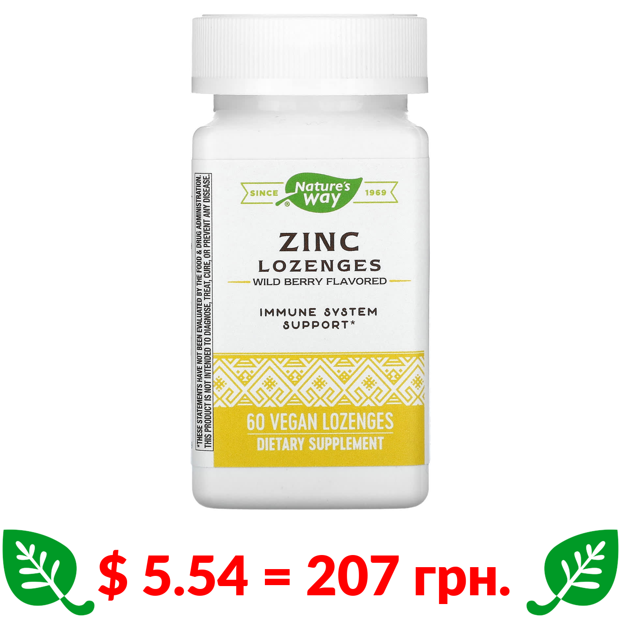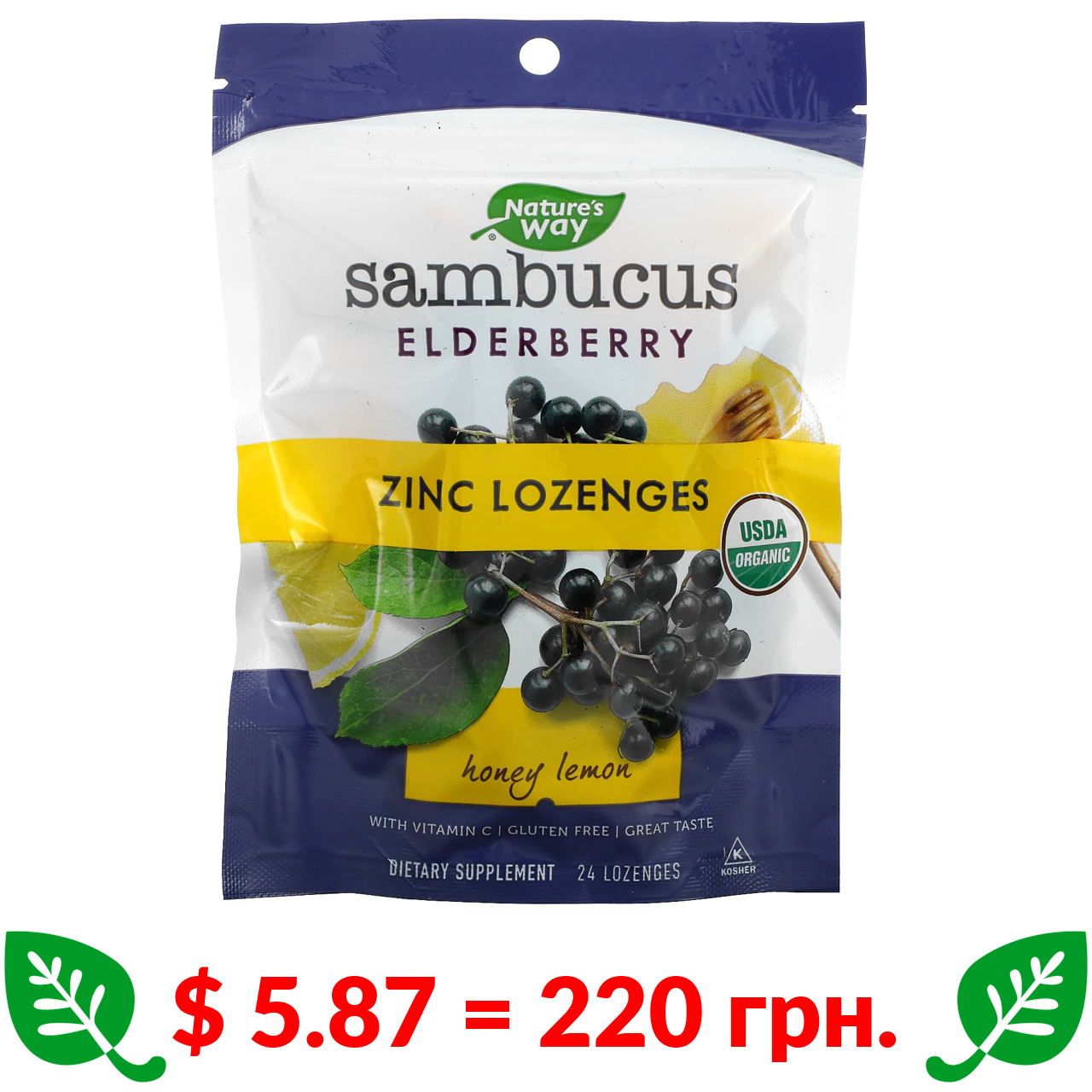 $ 5.87 = 220 грн. Nature’s Way, Sambucus, льодяники з цинком, вітаміном C, медом і лимоном, 24 льодяника