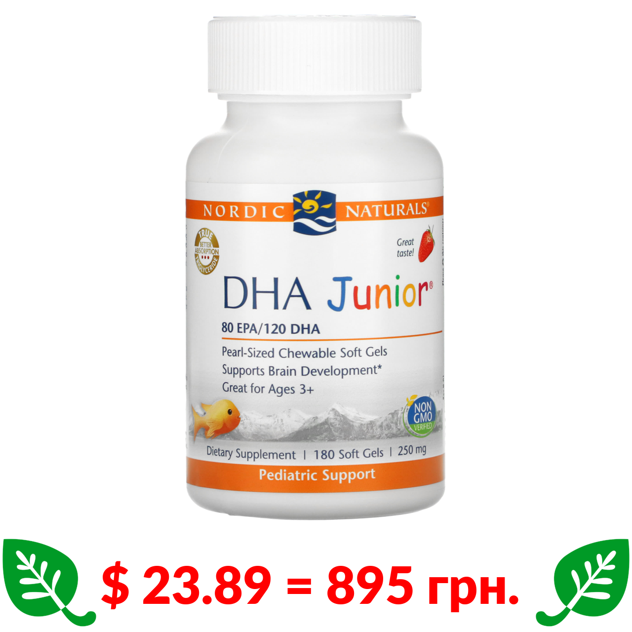 $ 23.89 = 895 грн. Nordic Naturals, DHA Junior, Great for Ages 3+, Strawberry, 62.5 mg, 180 Soft Gels