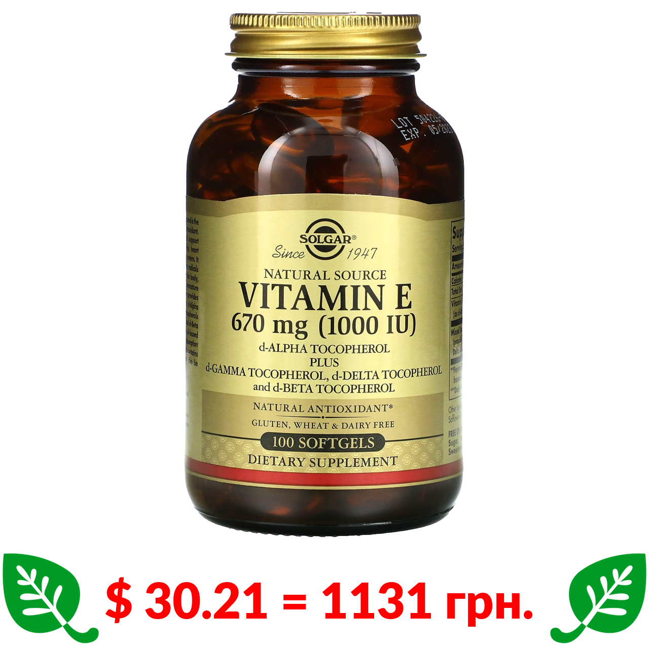 $ 30.21 = 1131 грн. Solgar, Natural Source Vitamin E, 670 mg (1,000 IU), 100 Softgels