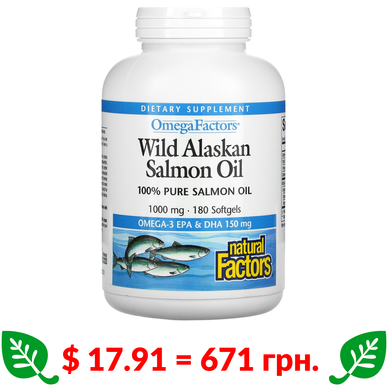 $ 17.91 = 671 грн. Natural Factors, олія дикого аляскінського лосося Omega Factors, 1000 мг, 180 капсул