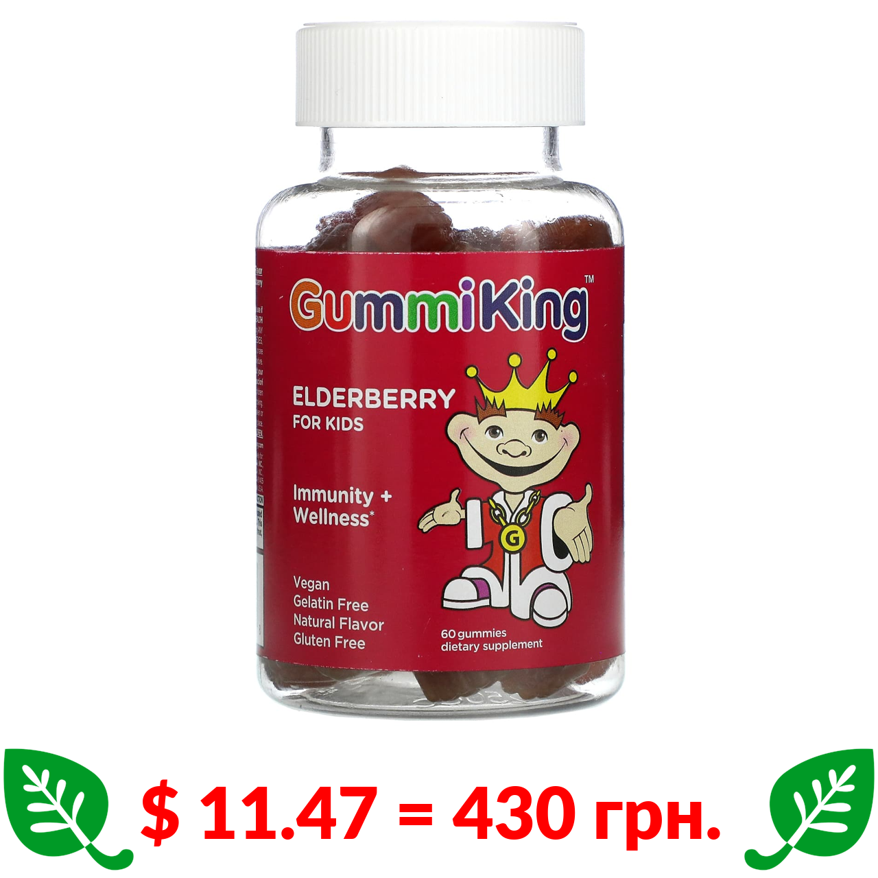 $ 11.47 = 430 грн. GummiKing, бузина для дітей, імунний захист + гарне самопочуття, смак малини, 60 жувальних мармеладок