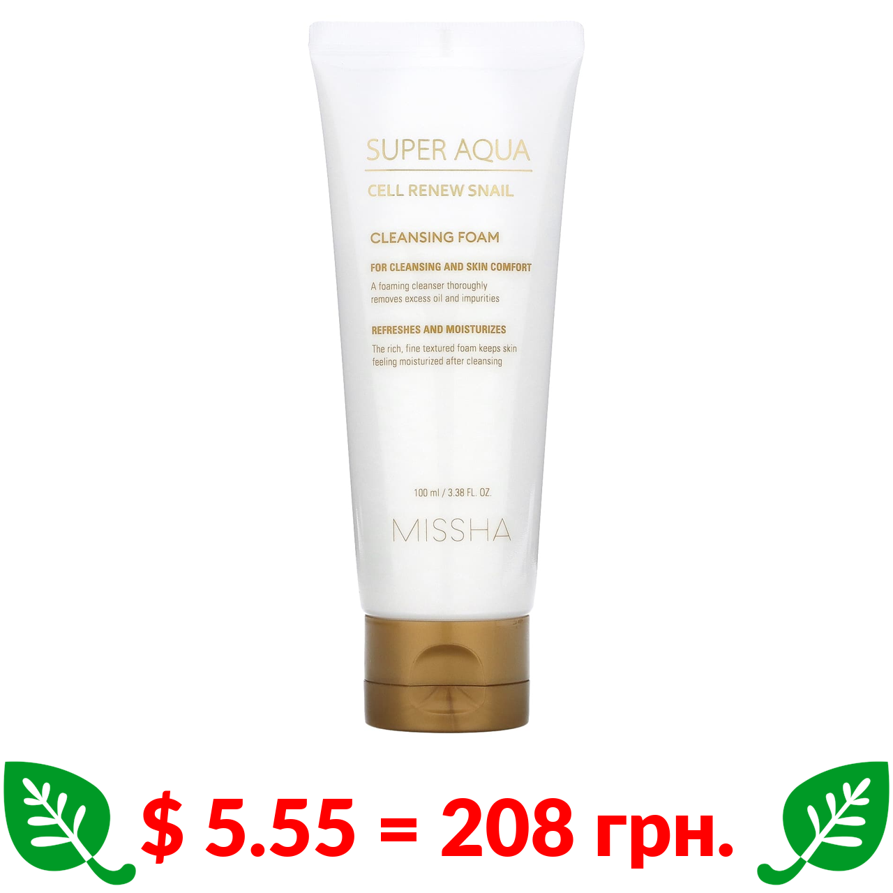$ 5.55 = 208 грн. ?️ у кошику ?️ Missha, Super Aqua, очищувальна пінка з екстрактом муцину равликів для відновлення клітин шкіри, 100 мл (3,38 рідк. унції)