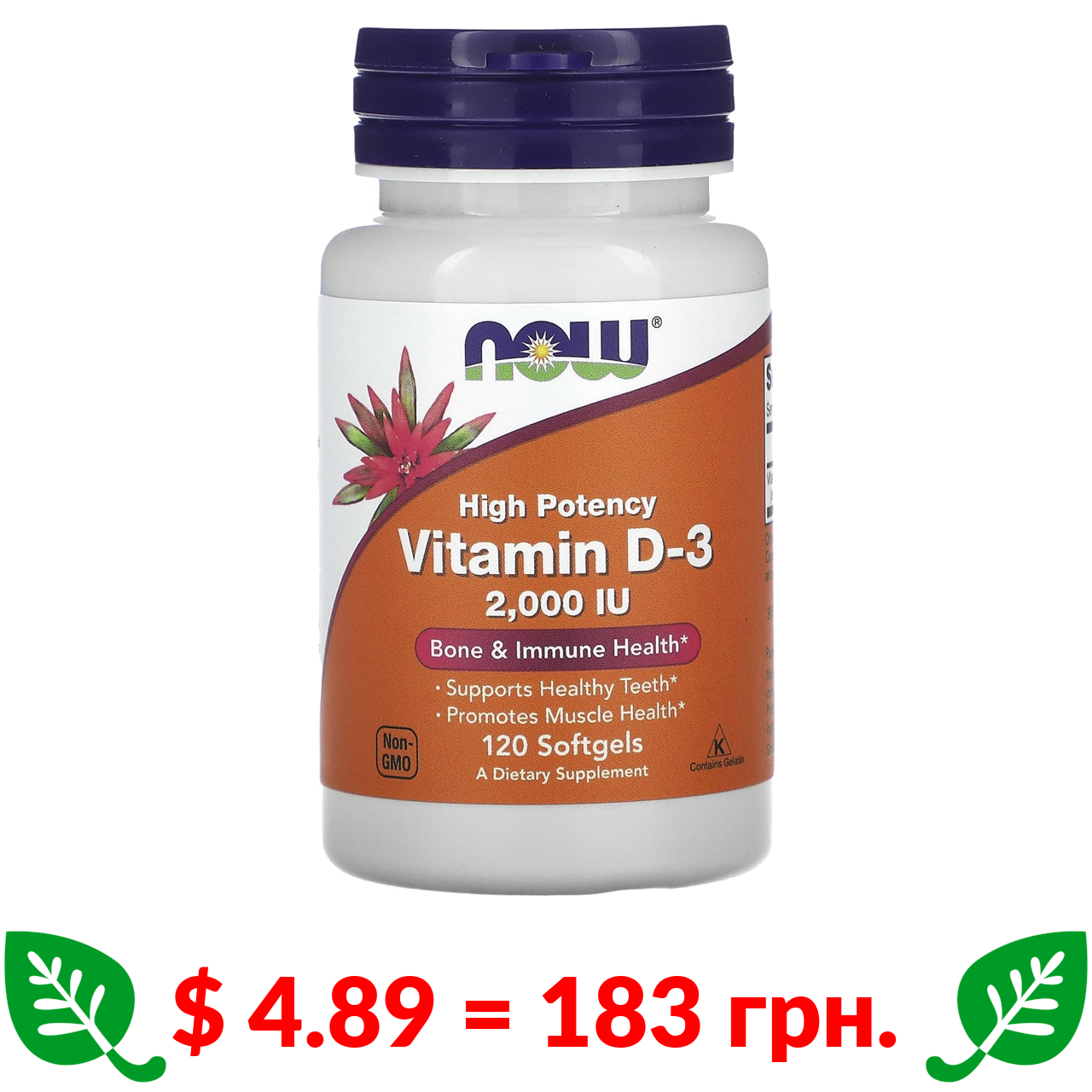 $ 4.89 = 183 грн. Now Foods, високоефективний вітамін D3, 50 мкг (2000 МО), 120 капсул