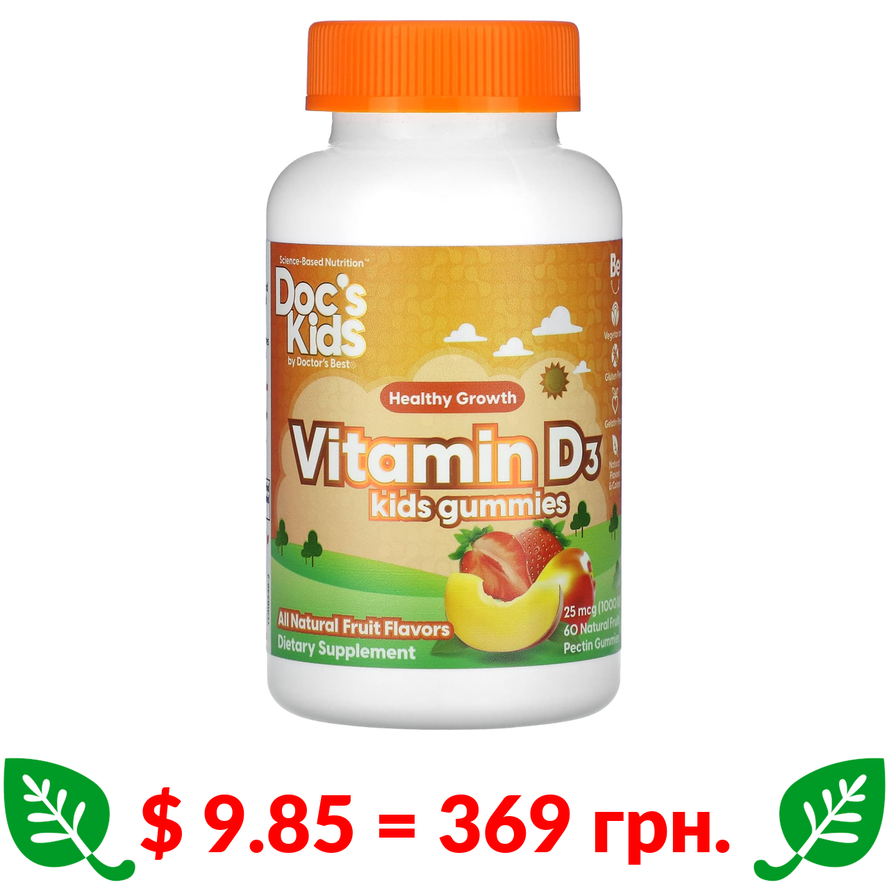 $ 9.85 = 369 грн. Doctor’s Best, Doc’s Kids, жувальні мармеладки з вітаміном D3, повністю натуральні фруктові ароматизатори, 25 мкг (1000 МО), 60 жувальних мармеладок з натуральним фруктовим пектином