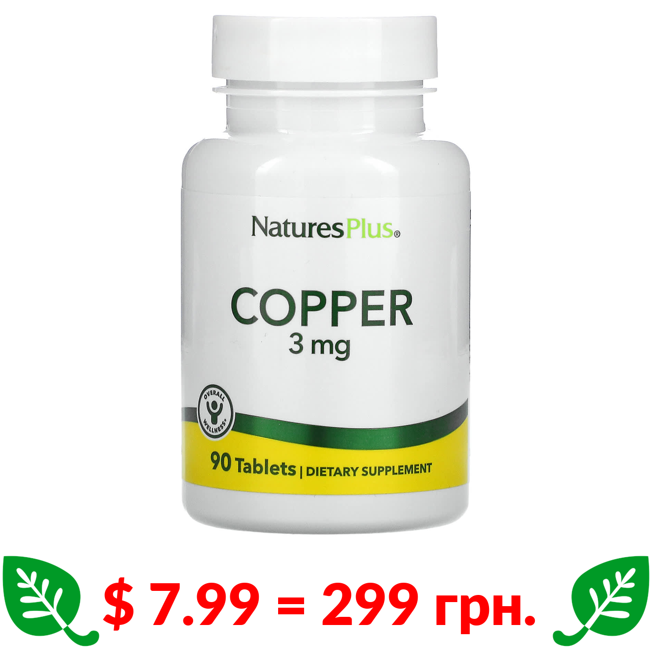 $ 7.99 = 299 грн. Nature’s Plus, мідь, 3 мг, 90 таблеток