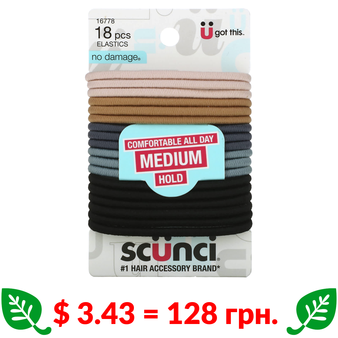 $ 3.43 = 128 грн. Scunci, No Damage Elastics, Comfortable All Day, Medium Hold, Neutral, 18 Pieces