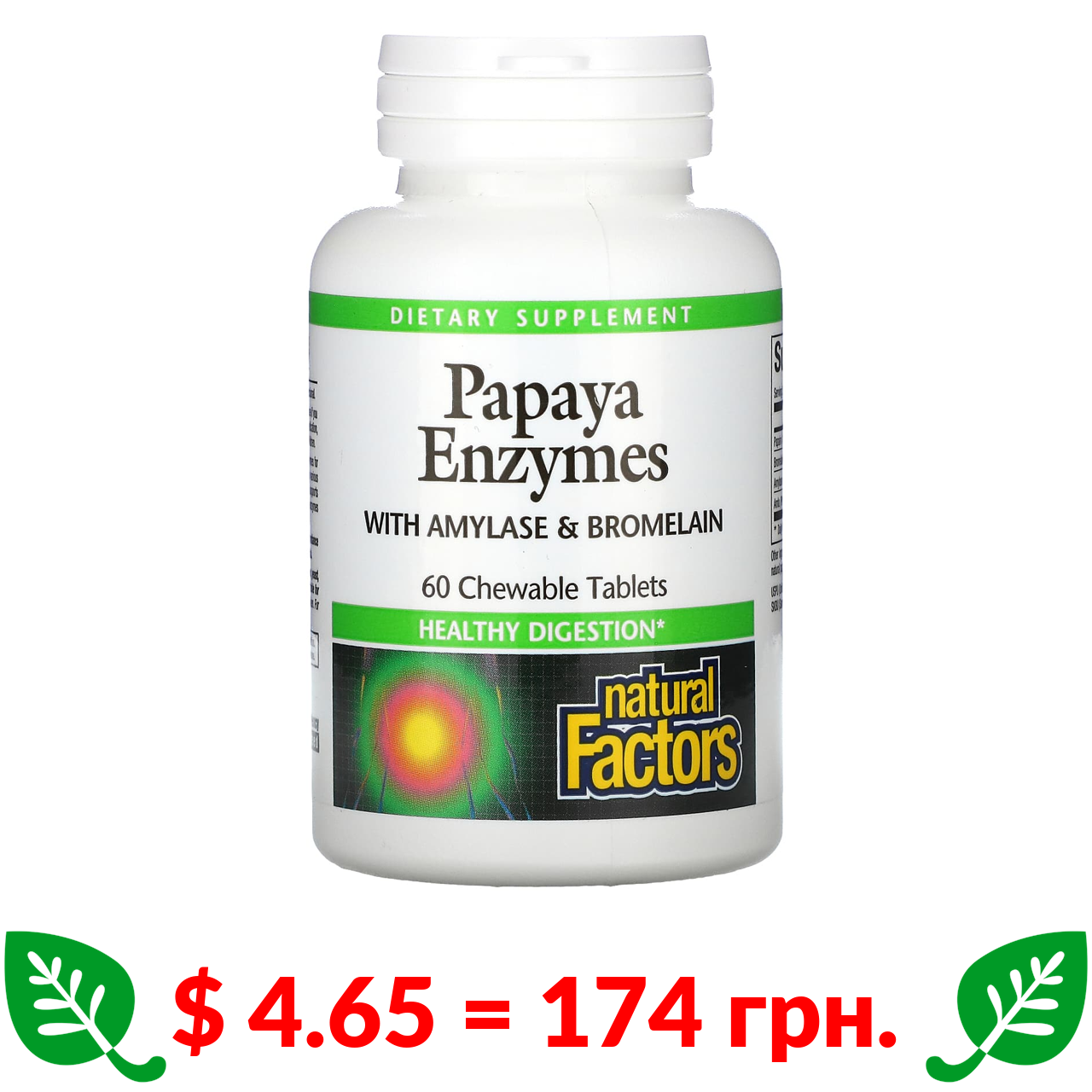 $ 4.65 = 174 грн. Natural Factors, ферменти папаї з амілазою та бромелаїном, 60 жувальних таблеток