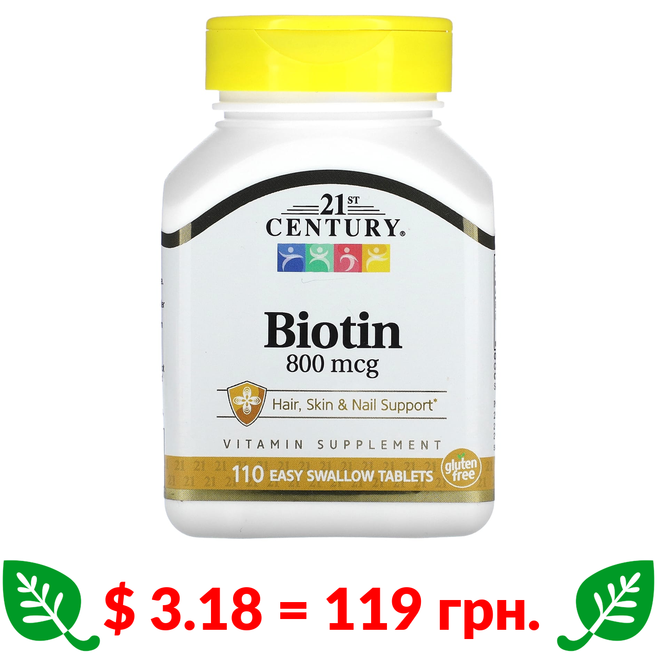 $ 3.18 = 119 грн. 21st Century, біотин, 800 мкг, 110 таблеток, які легко ковтати