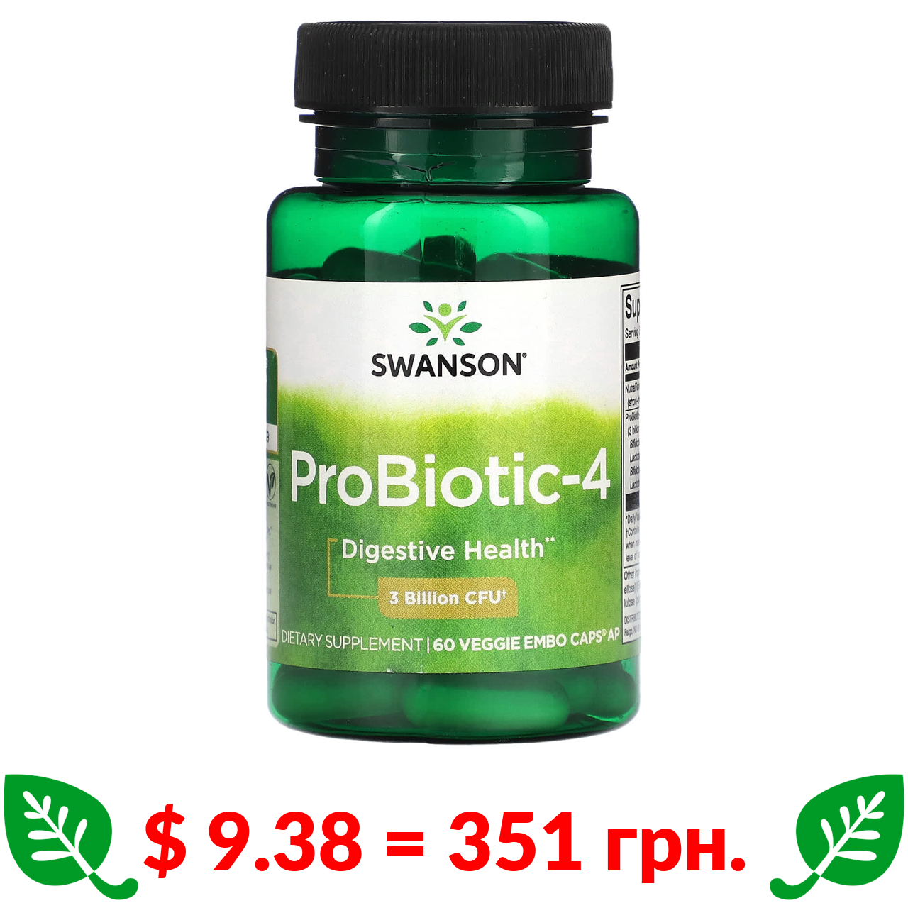 $ 9.38 = 351 грн. Swanson, ProBiotic-4, 3 млрд КУО, 60 веганських капсул Embo AP