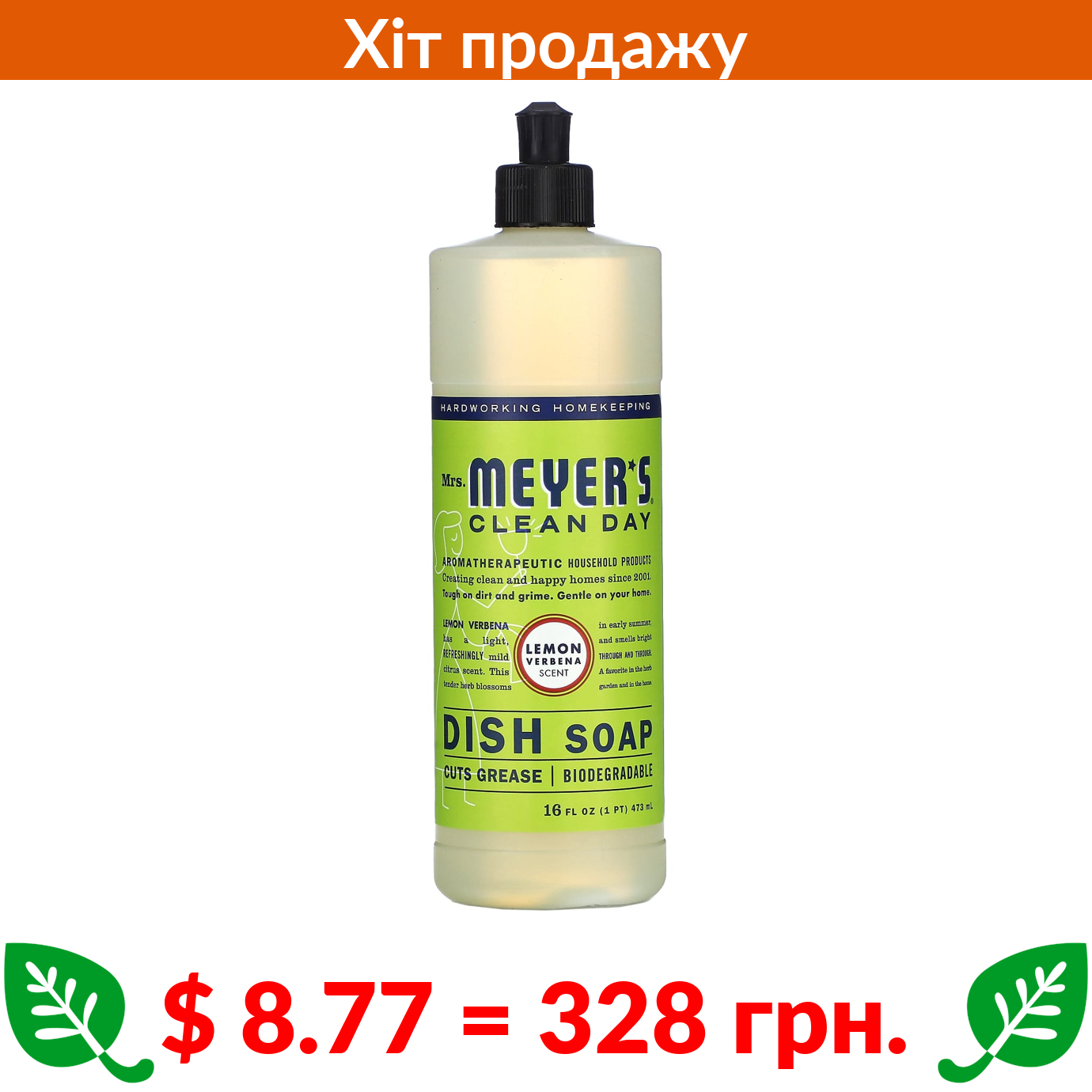 $ 8.77 = 328 грн. Mrs. Meyers Clean Day, засіб для миття посуду, лимонна вербена, 16 рідких унцій (473 мл)