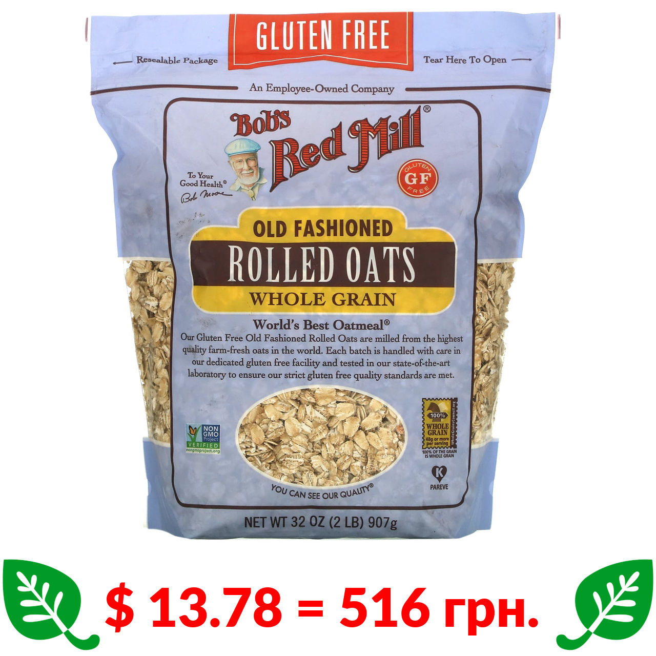 $ 13.78 = 516 грн. Bob’s Red Mill, вівсяні пластівці, цільнозернові, класичний рецепт, без глютену, 907 г (32 унції)