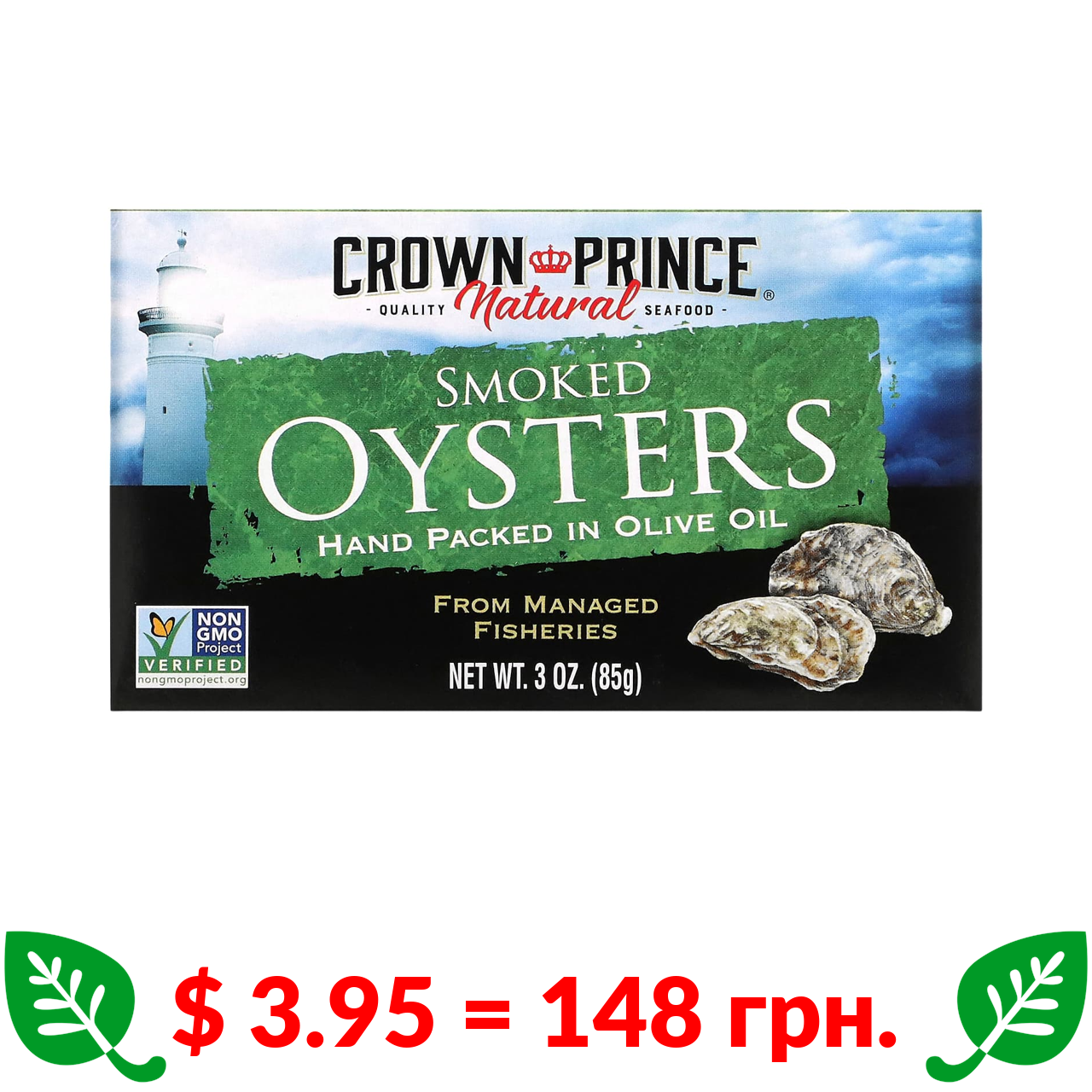 $ 3.95 = 148 грн. Crown Prince Natural, копчені устриці в оливковій олії, 85 г (3 унції)