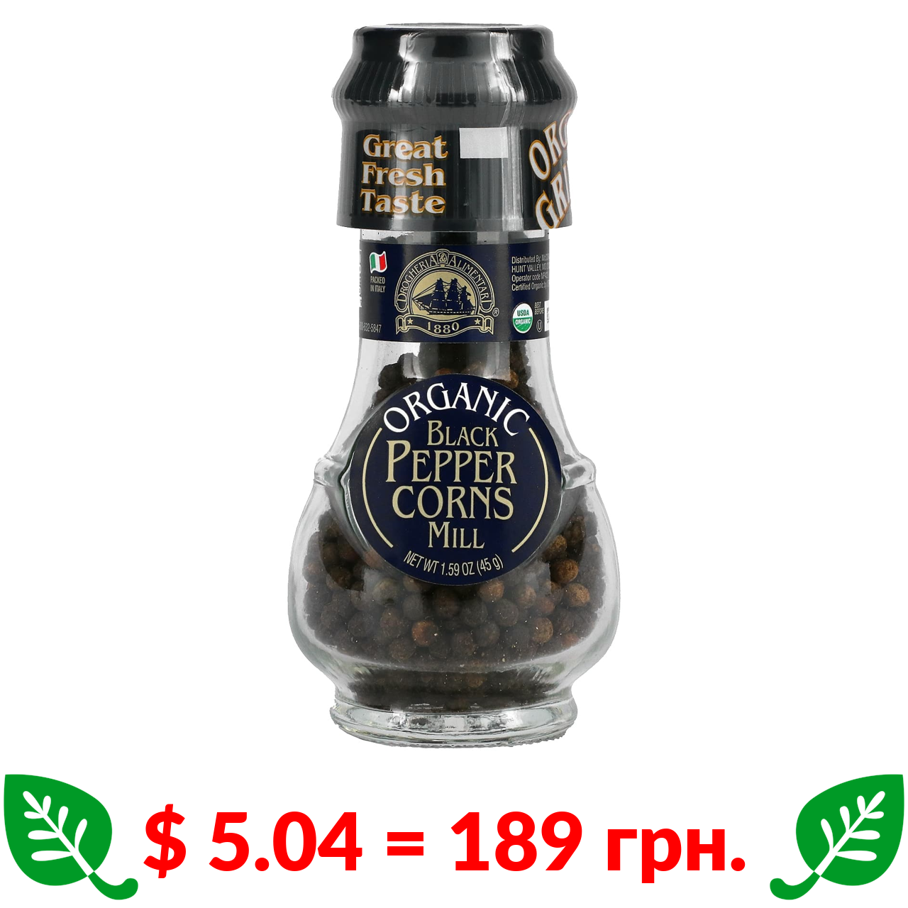 $ 5.04 = 189 грн. Drogheria & Alimentari, органічний чорний перець у млинку, 45 г (1,58 унції)