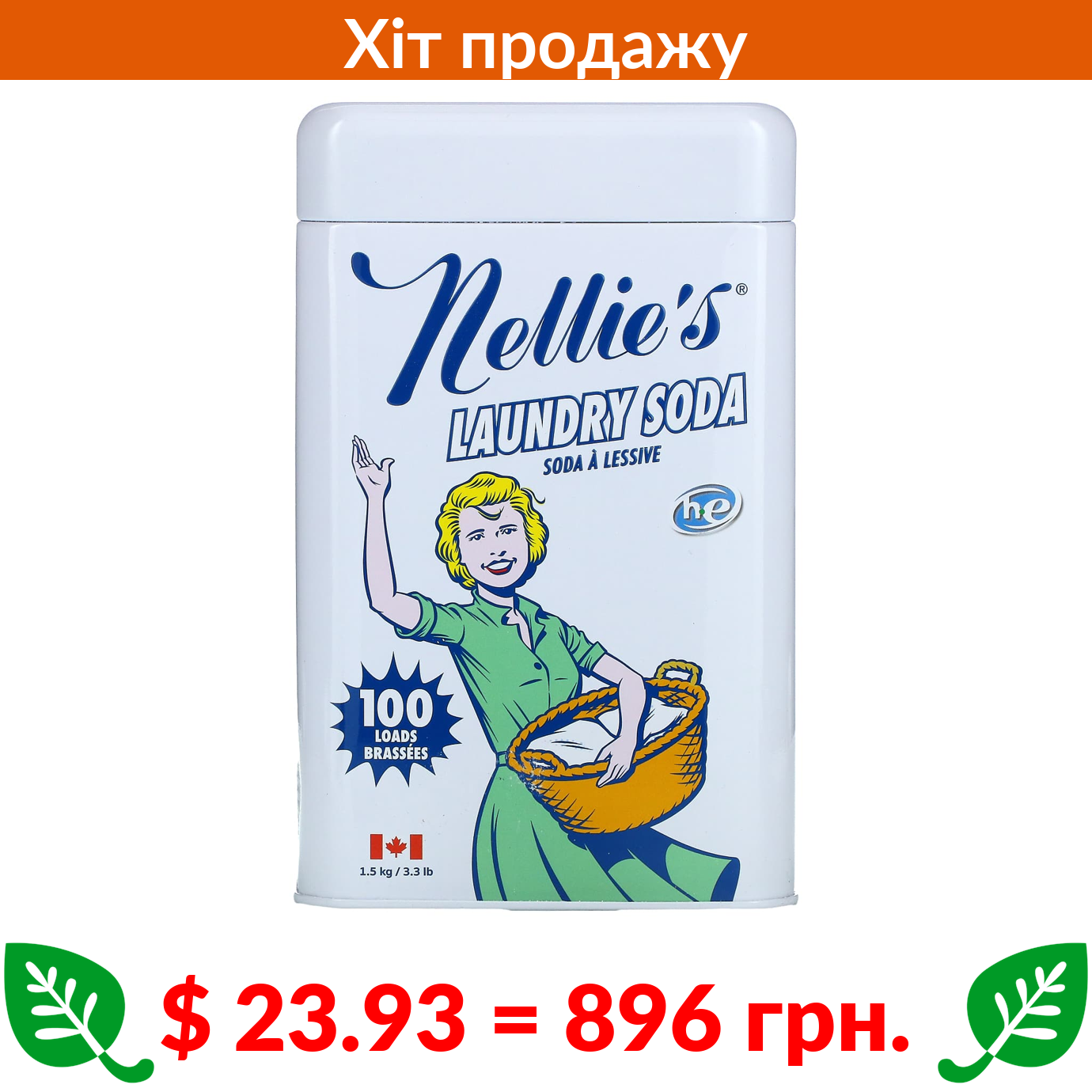 $ 23.93 = 896 грн. Nellie’s, сода для прання, 100 завантажень, 3,3 фунта (1,5 кг)