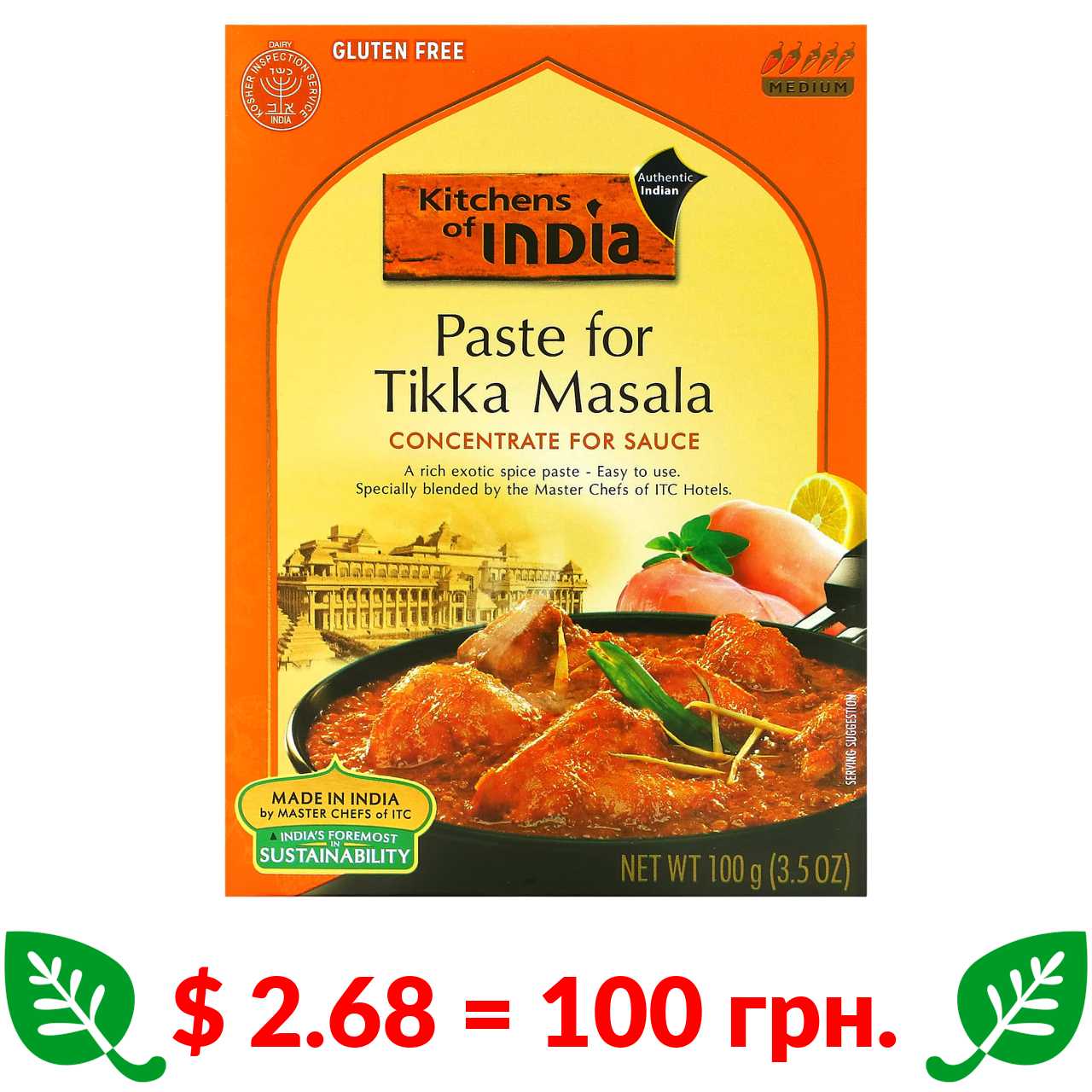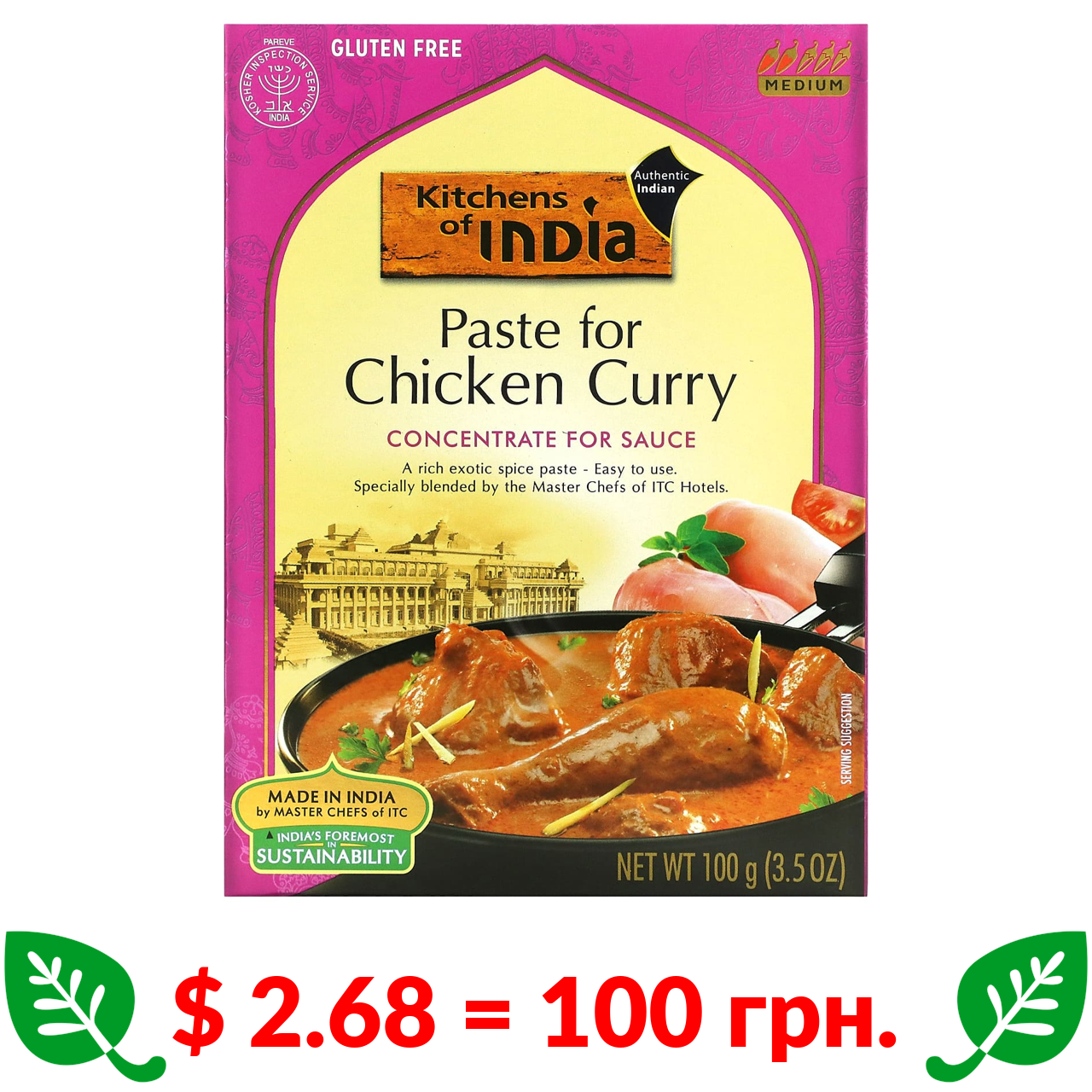$ 2.68 = 100 грн. Kitchens of India, Паста для курячого каррі, концентрат для соусу, середня, 3,5 унції (100 г)