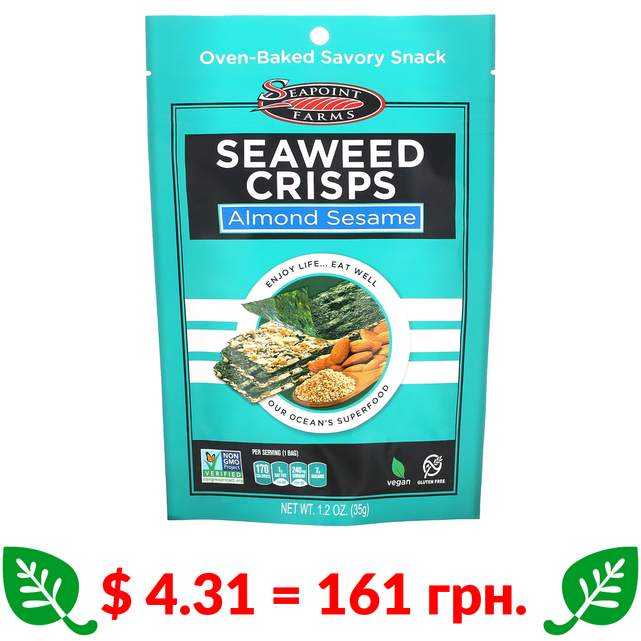 $ 4.31 = 161 грн. Seapoint Farms, чіпси з морськими водоростями, мигдаль та кунжут, 35 г (1,2 унції)