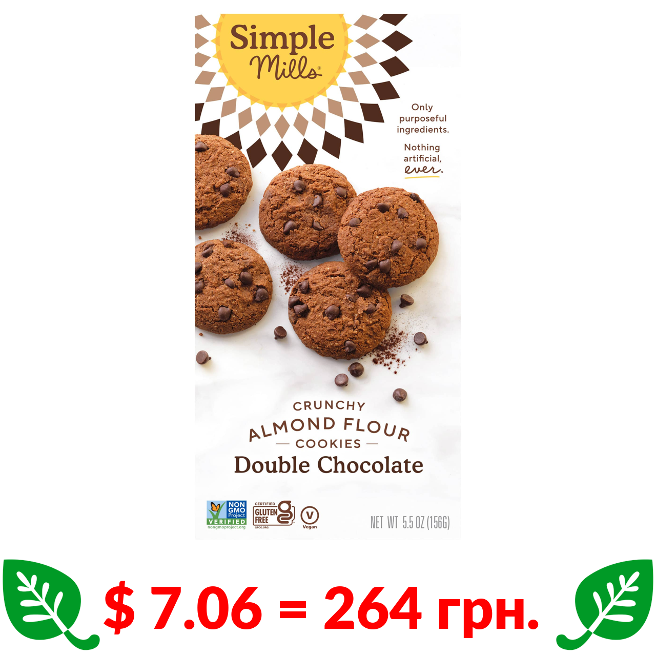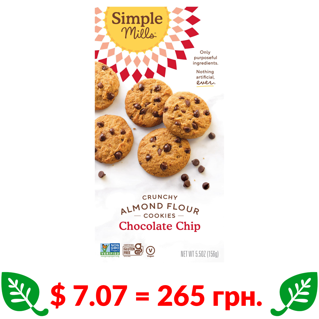 $ 7.07 = 265 грн. Simple Mills, хрустке печиво з мигдальним борошном і шоколадними крихтами, 156 г (5,5 унції)