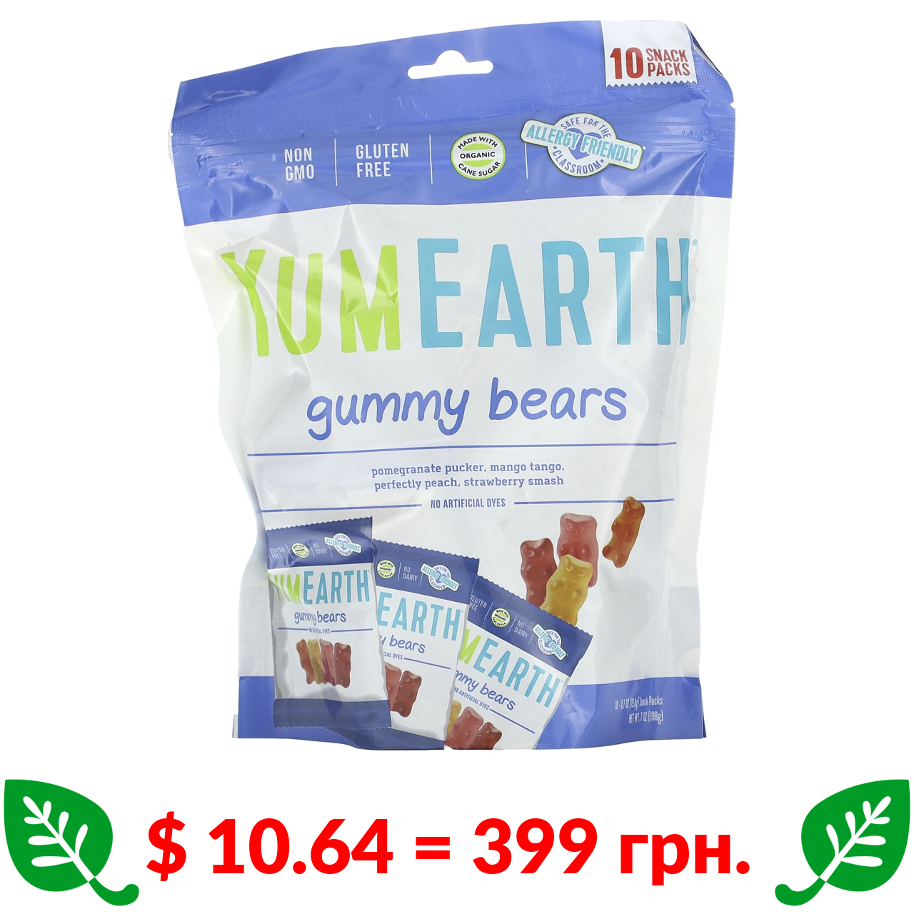 $ 10.64 = 399 грн. YumEarth, жувальні ведмедики, різні смаки, 10 пакетиків по 19,8 г (0,7 унції)
