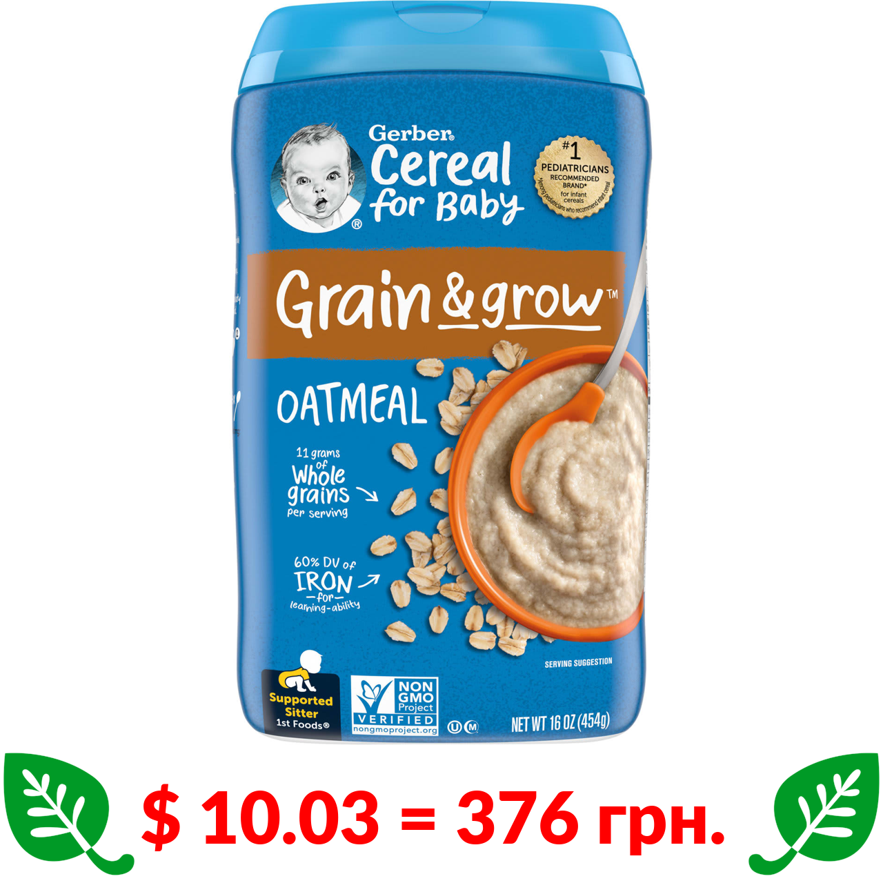 $ 10.03 = 376 грн. Gerber, Вівсянка, однозернова каша, 1st Foods, 16 унцій (454 г)