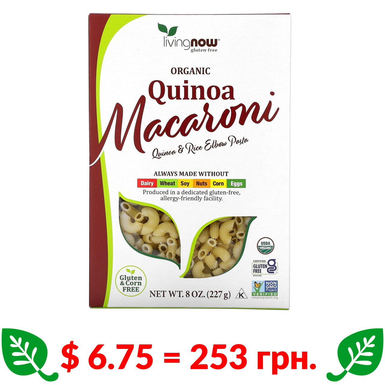 $ 6.75 = 253 грн. Now Foods, Органічні макарони з кіноа, без глютену, 227 г (8 унцій)
