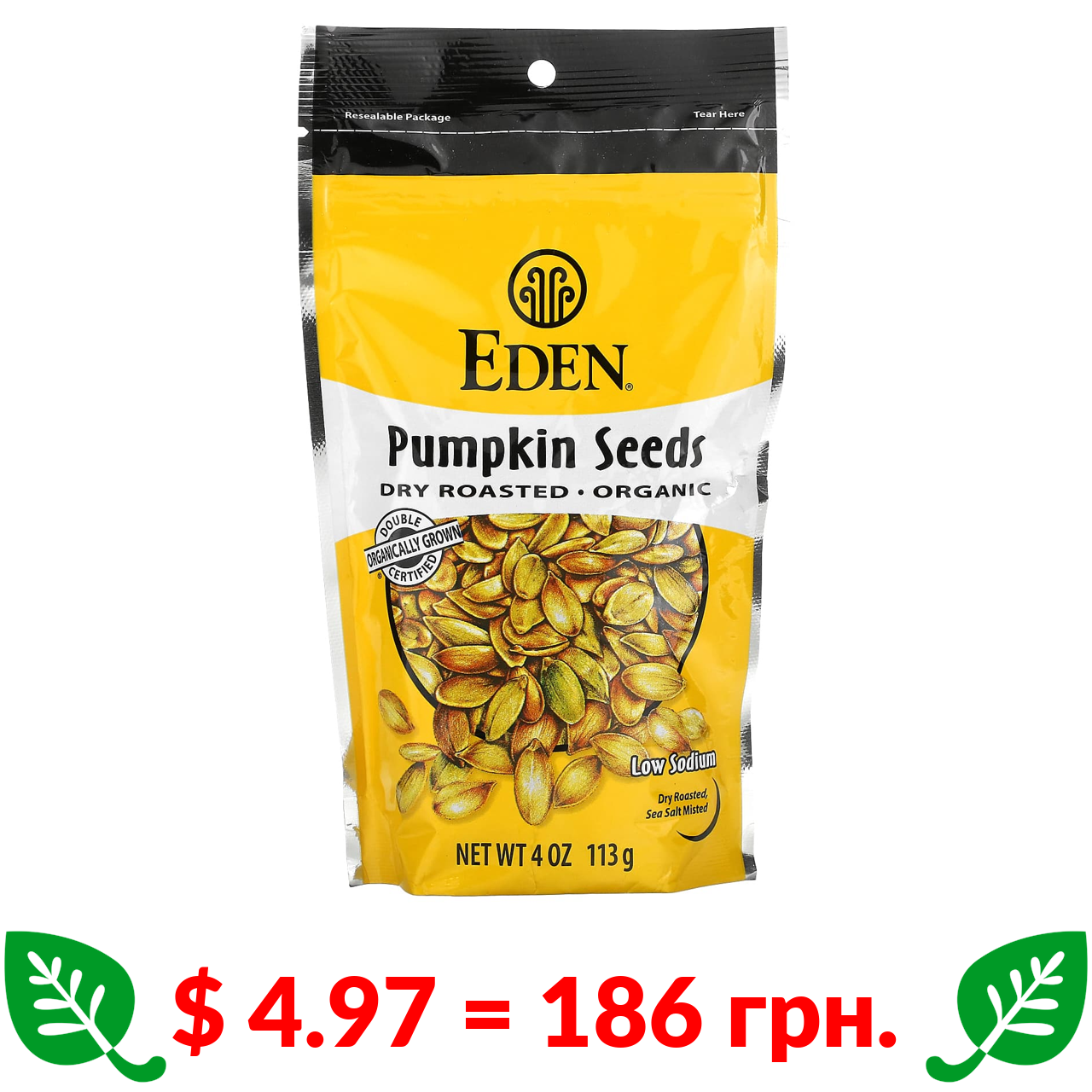 $ 4.97 = 186 грн. Eden Foods, органічне гарбузове насіння, сухого смаження, 113 г (4 унції)