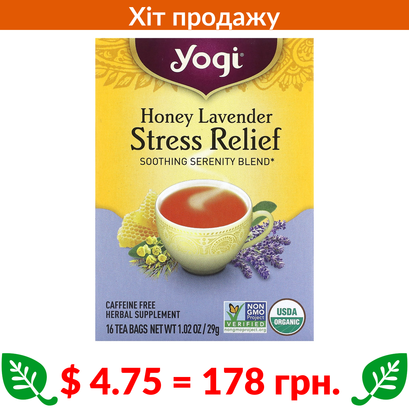 $ 4.75 = 178 грн. Yogi Tea, Stress Relief, Honey Lavender, Caffeine Free, 16 Tea Bags, 1.02 oz (29 g)