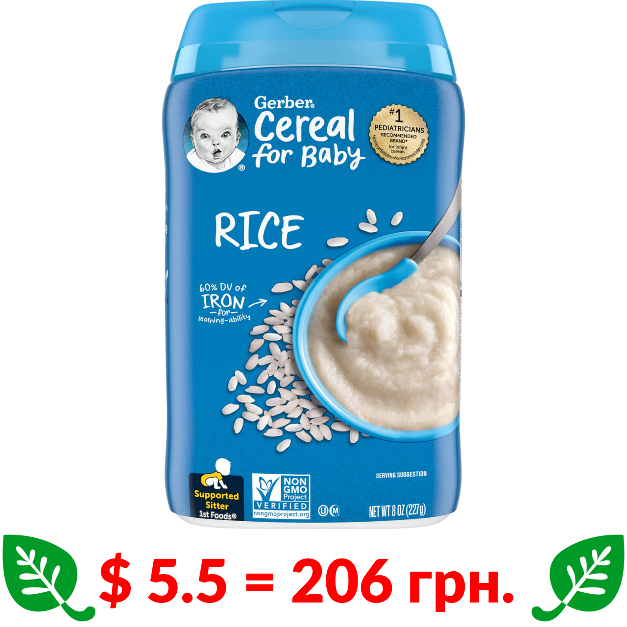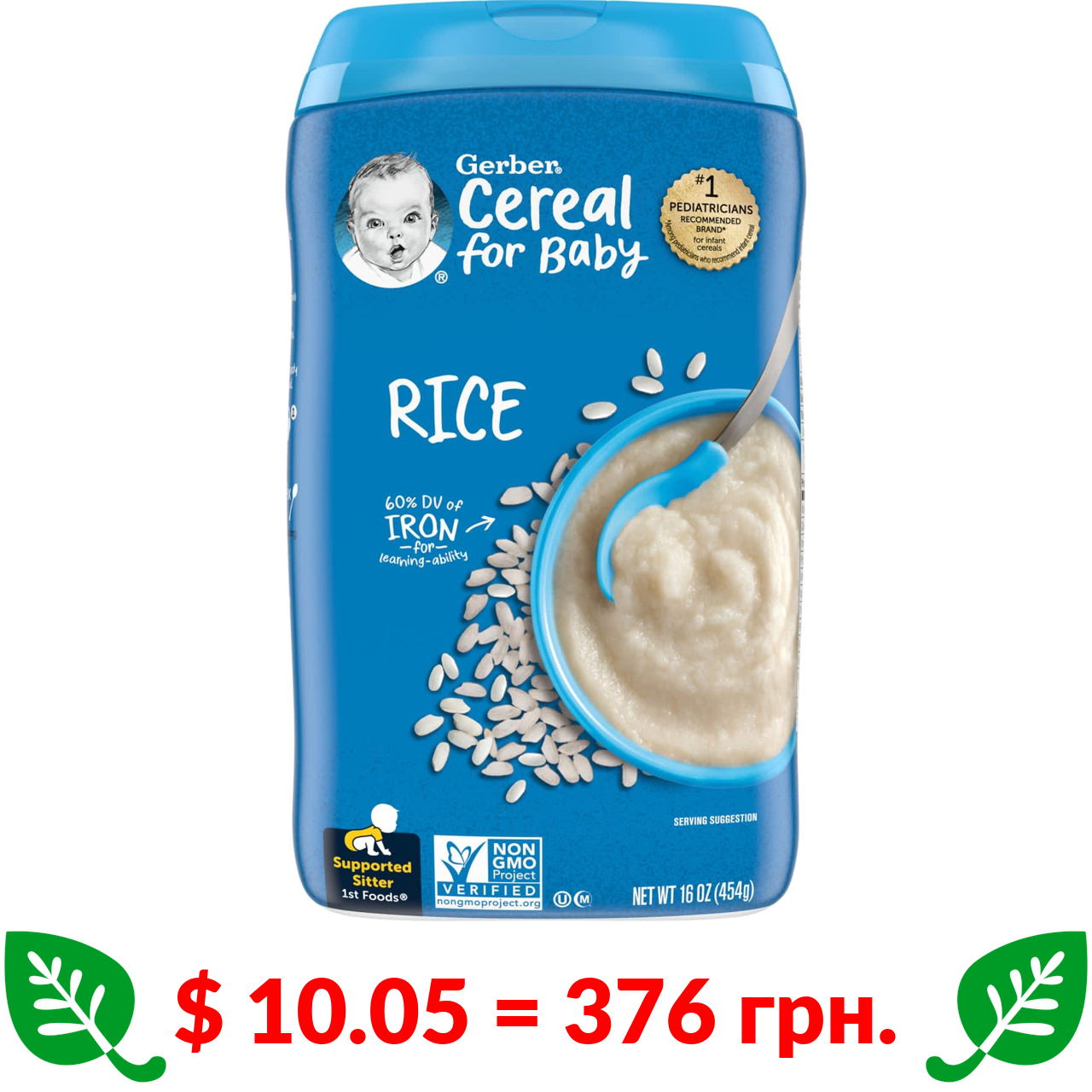 $ 10.05 = 376 грн. Gerber, Рисова однозернова каша, 1st Foods, 16 унцій (454 г)