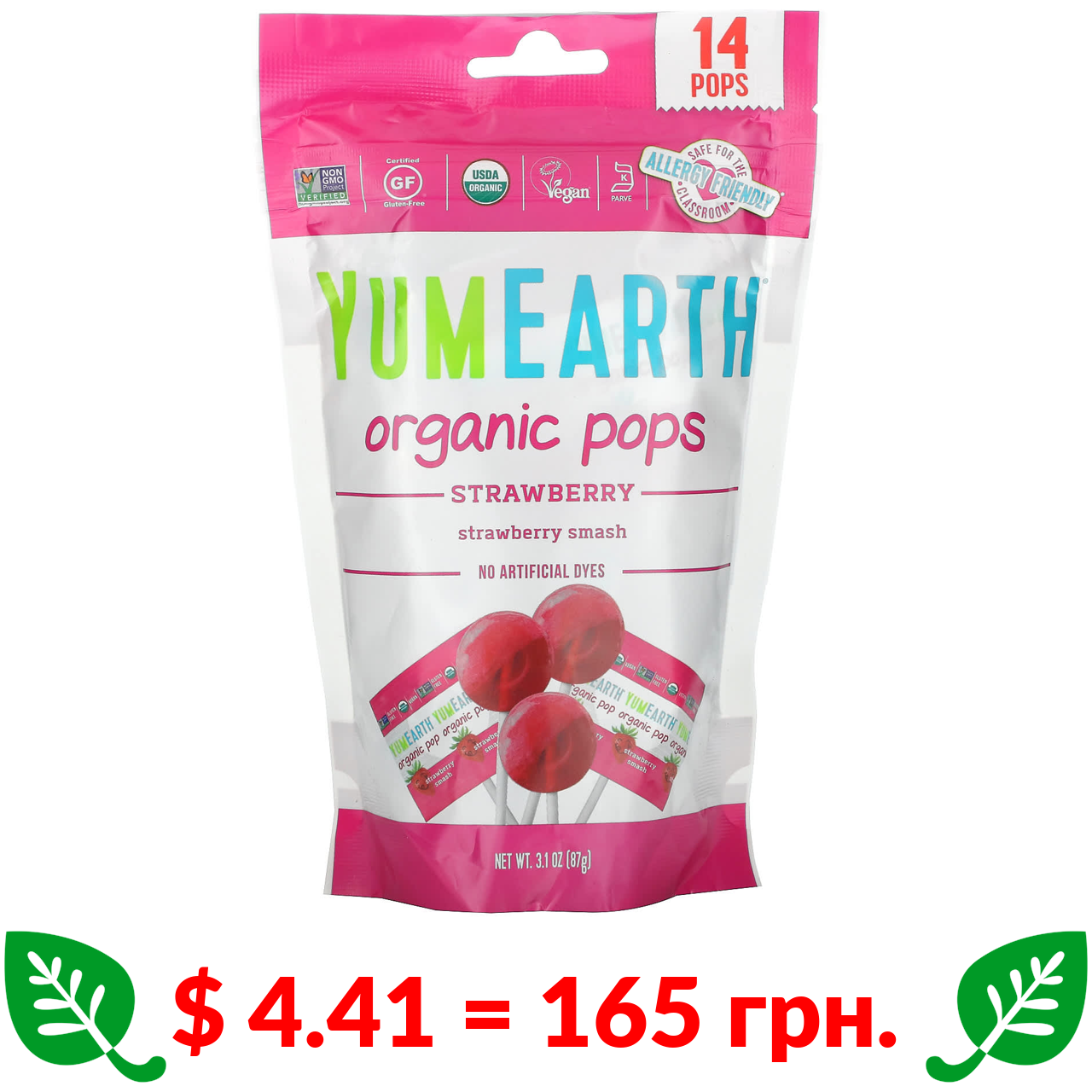 $ 4.41 = 165 грн. YumEarth, льодяники з органічної полуниці, 14 льодяників, 87 г (3,1 унції)