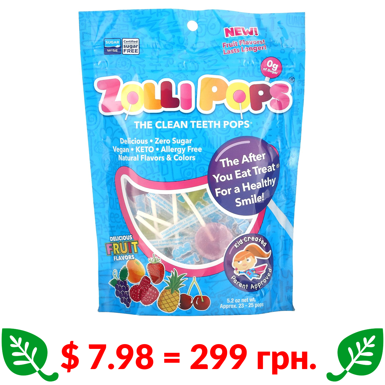 $ 7.98 = 299 грн. Zollipops, The Clean Teeth Pops, льодяники для чищення зубів, полуниця, апельсин, малина, вишня, виноград, ананас, прибл. 23–25 льодяників ZolliPops, 147 г (5,2 унції)