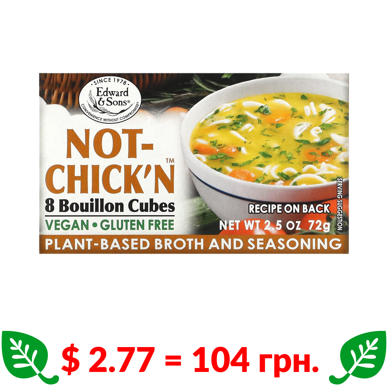 $ 2.77 = 104 грн. Edward & Sons, Not-Chick’n, бульйонні кубики, 8 кубиків