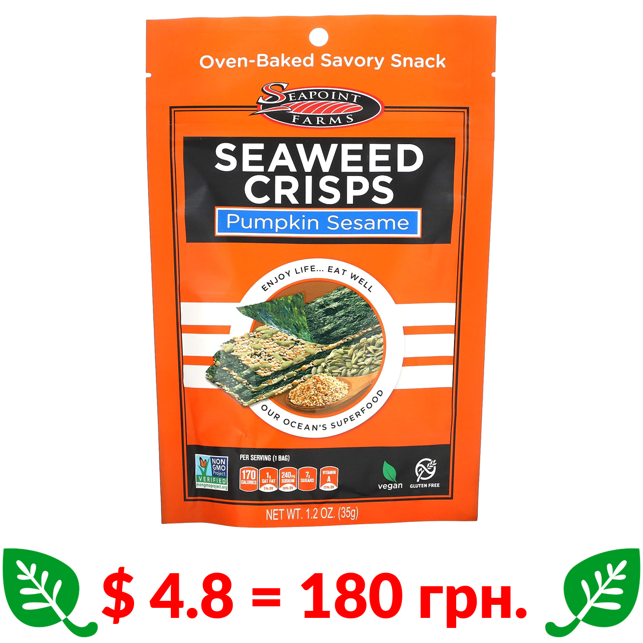 $ 4.8 = 180 грн. Seapoint Farms, чіпси з морськими водоростями, гарбуз і кунжут, 35 г (1,2 унції)
