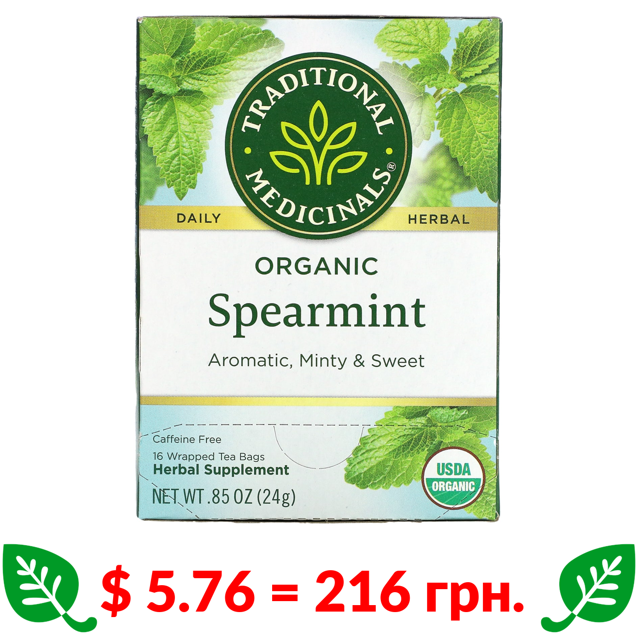 $ 5.76 = 216 грн. Traditional Medicinals, Organic Spearmint, Caffeine Free, 16 Wrapped Tea Bags, .85 oz (24 g)