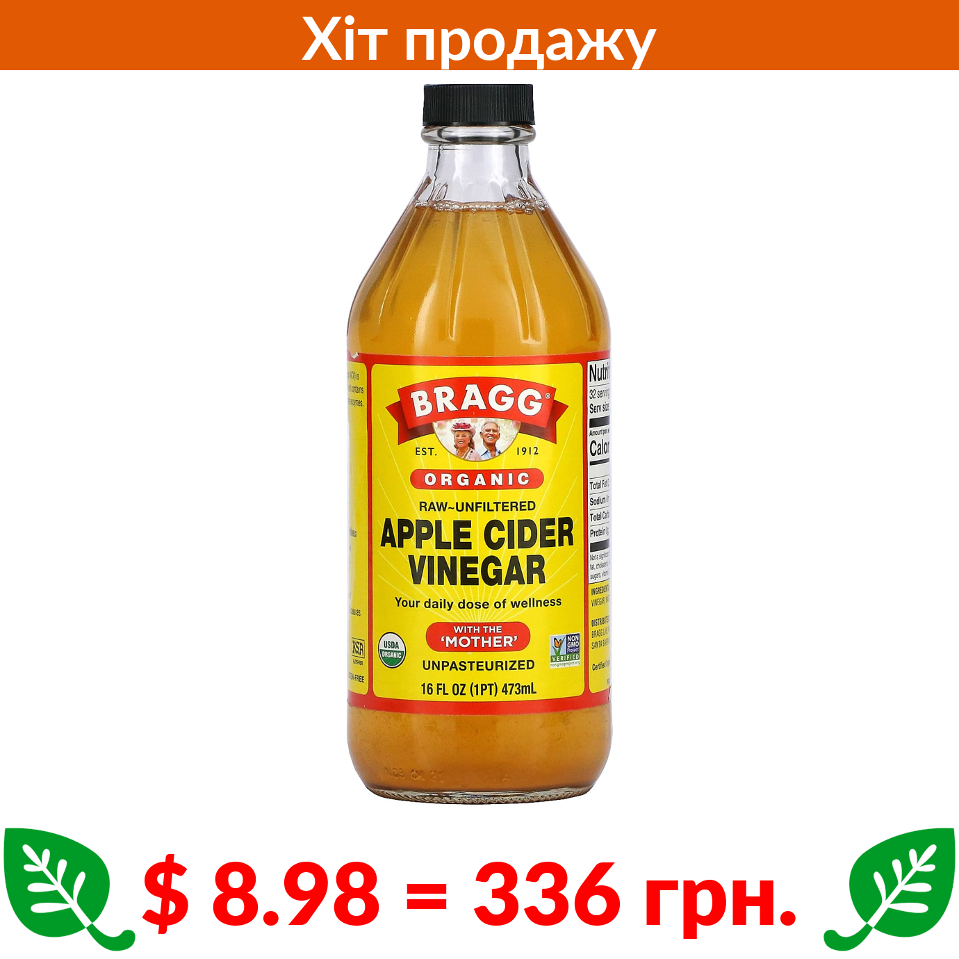$ 8.98 = 336 грн. Bragg, Organic Apple Cider Vinegar with The ‘Mother’, Raw-Unfiltered, 16 fl oz (473 ml)