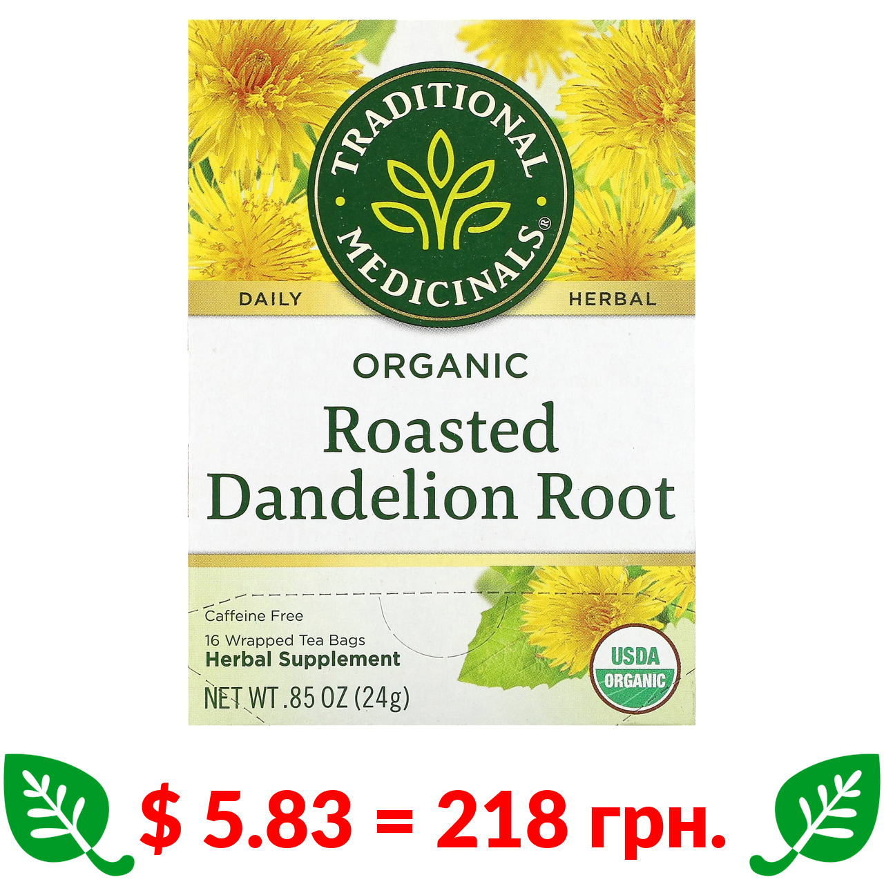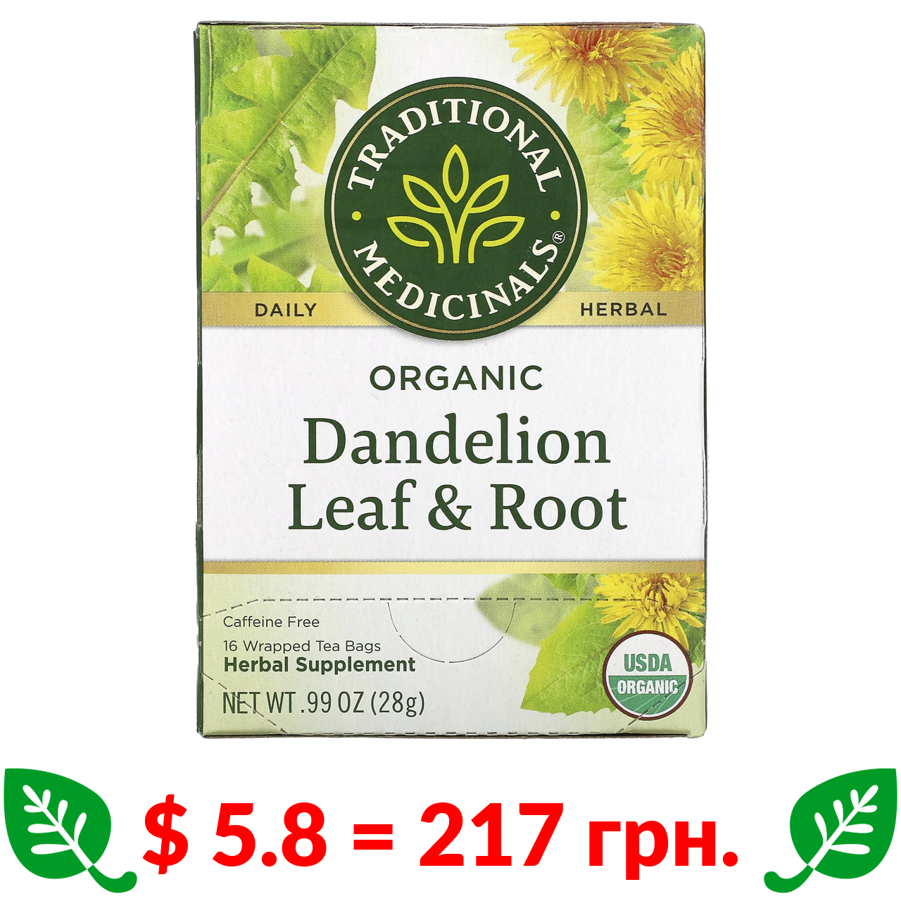 $ 5.8 = 217 грн. Traditional Medicinals, Herbal Teas, Organic Dandelion Leaf & Root Tea, Caffeine Free, 16 Wrapped Tea Bags, 0.99 oz (28 g)