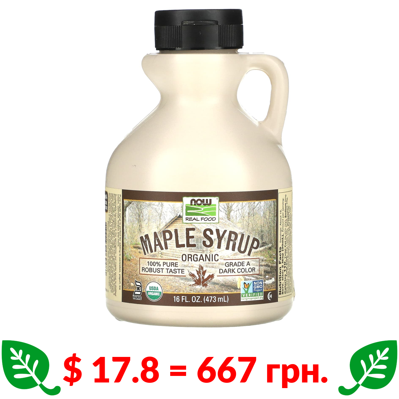 $ 17.8 = 667 грн. Now Foods, Real Food, органічний кленовий сироп, клас A, темного кольору, 473 мл (16 рідк. унцій)