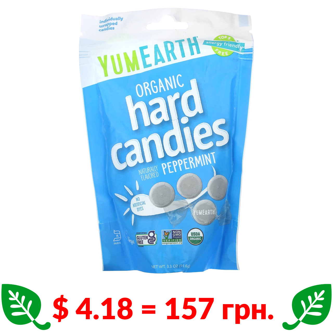 $ 4.18 = 157 грн. YumEarth, органічні льодяники, перцева м’ята, 93,6 г (3,3 унції)