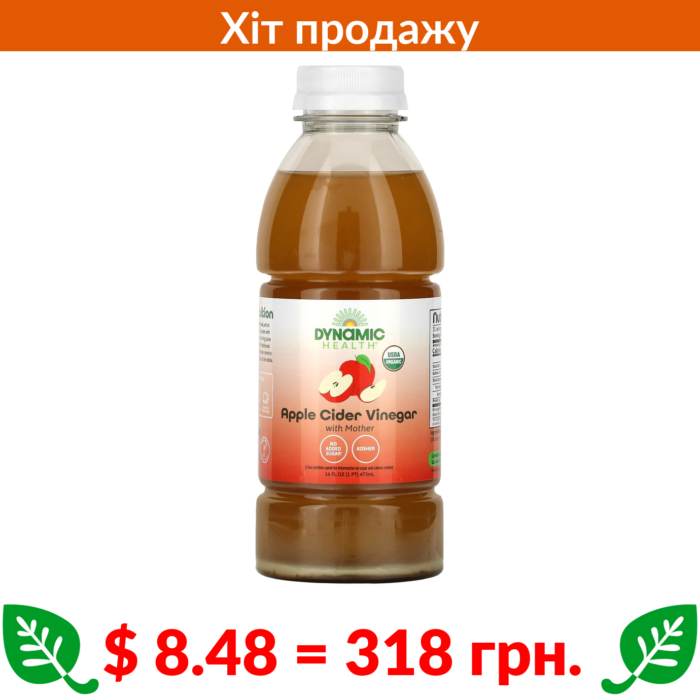 $ 8.48 = 318 грн. Dynamic Health, органічний яблучний оцет із маткою, 473 мл (16 рідк. унцій)