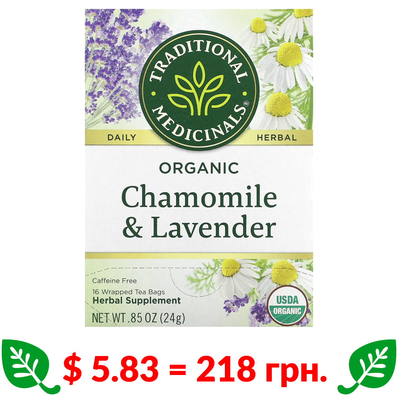 $ 5.83 = 218 грн. Traditional Medicinals, органічні ромашка та лаванда, без кофеїну, 16 чайних пакетиків в індивідуальній упаковці, 24 г (0,85 унції)