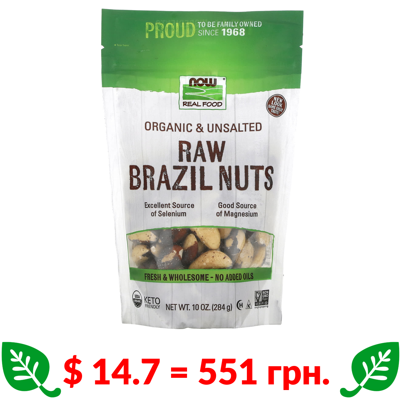 $ 14.7 = 551 грн. Now Foods, Real Food, органічні бразильські горіхи, несолоні, 284 г (10 унцій)